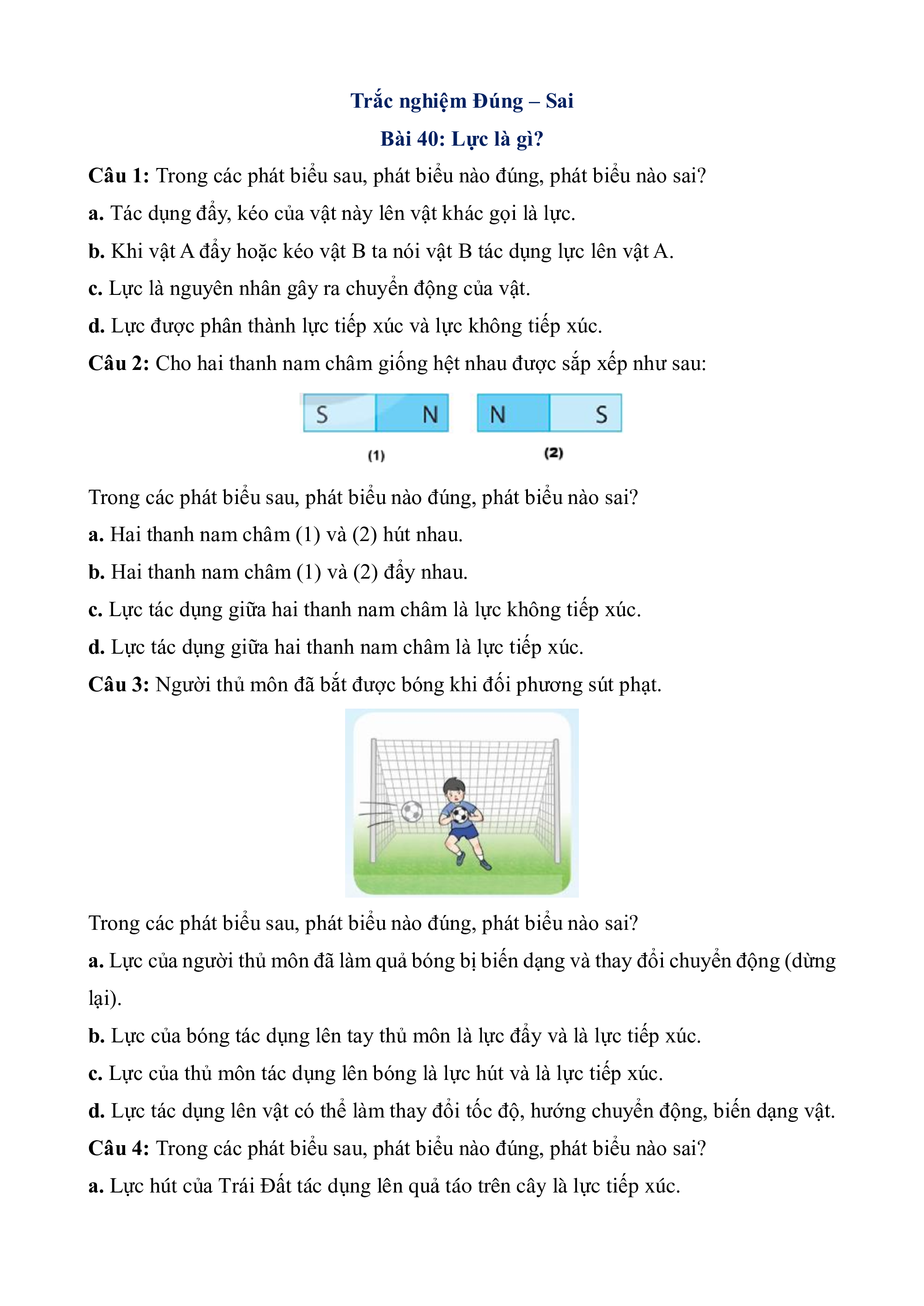 c. Lực hút giữa hai thanh nam châm khi đặt các cực khác tên gần nhau là lực tiếp xúc.