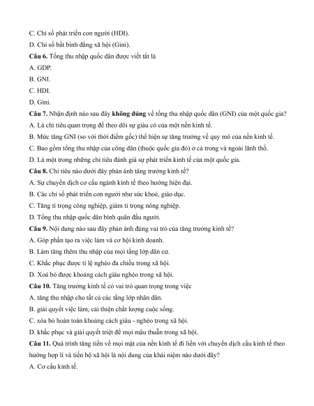 Câu 6. Tổng thu nhập quốc dân được viết tắt là A. GDP. B. GNI. C. HDI. D. Gini.