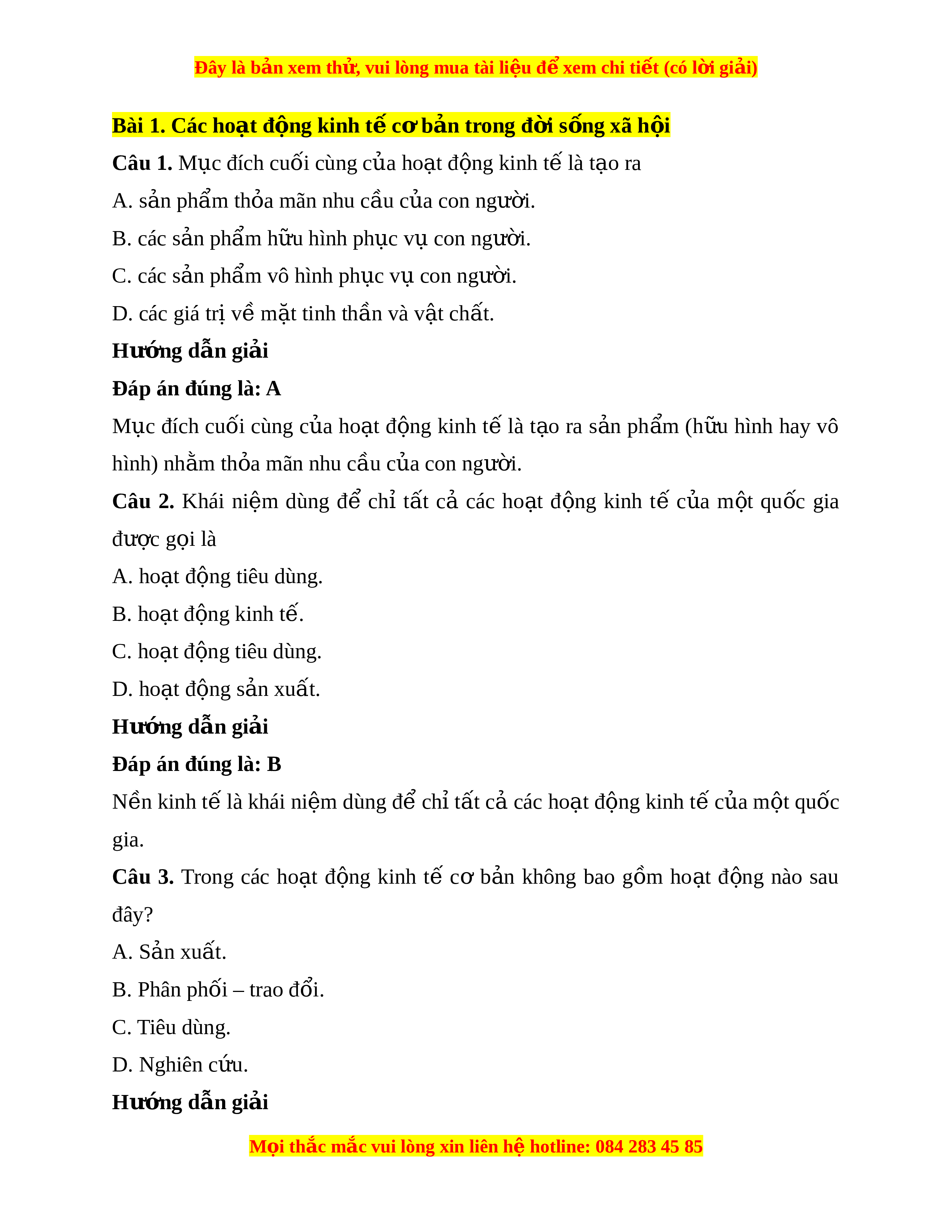 Câu 1. Mục đích cuối cùng c a ủ ho t ạ đ ng ki ộ nh t l ế à t o ạ ra A. s n ph ả ẩm th a m ỏ ãn nhu c u c ầ a ủ con ngư i ờ . B. các s n ph ả ẩm h u hì ữ nh ph c v ụ con ụ ngư i ờ . C. các s n ph ả ẩm vô hình ph c v ụ con ng ụ ư i ờ . D. các giá tr v ị m ề t ặ tinh th n và v ầ t ậ ch t ấ . Hư ng d ớ ẫn gi i ả Đáp án đúng là: A Mục đích cu i ố cùng c a ủ ho t ạ đ ng ộ kinh t ế là t o ạ ra s n ả ph m ẩ (h u ữ hình hay vô hình) nh m ằ th a ỏ mãn nhu c u c ầ a con ng ủ ư i ờ . Câu 2. Khái ni m ệ dùng để chỉ t t ấ cả các ho t ạ đ ng ộ kinh tế c a ủ m t ộ qu c ố gia đư c ợ g i ọ là A. ho t ạ đ ng t ộ iêu dùng. B. ho t ạ đ ng ki ộ nh t . ế C. ho t ạ đ ng t ộ iêu dùng. D. ho t ạ đ ng s ộ n xu ả t ấ . Hư ng d ớ ẫn gi i ả Đáp án đúng là: B N n ề kinh tế là khái ni m ệ dùng để ch t ỉ t ấ c các ho ả t ạ đ ng ki ộ nh t c ế a m ủ t ộ qu c ố gia. Câu 3. Trong các ho t ạ đ ng ộ kinh tế cơ b n ả không bao g m ồ ho t ạ đ ng ộ nào sau đây? A. S n ả xu t ấ . B. Phân ph i ố – trao đ i ổ . C. Tiêu dùng. D. Nghiên c u. ứ Hư ng d ớ ẫn gi i ả M i
