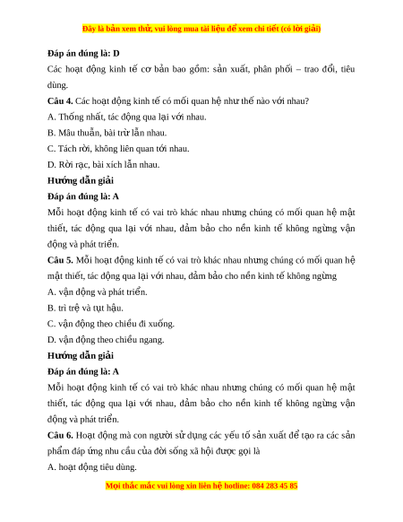 Đây là bản xem th , vu ử i lòng mua tài li u ệ đ xe ể m chi ti t (c ế ó l i ờ gi i ả ) Đáp án đúng là: D Các ho t ạ đ ng ộ kinh tế cơ b n ả bao g m ồ : s n ả xu t ấ , phân ph i ố – trao đ i ổ , tiêu dùng. Câu 4. Các ho t ạ đ ng ộ kinh t có m ế i ố quan h nh ệ ư thế nào v i ớ nhau?