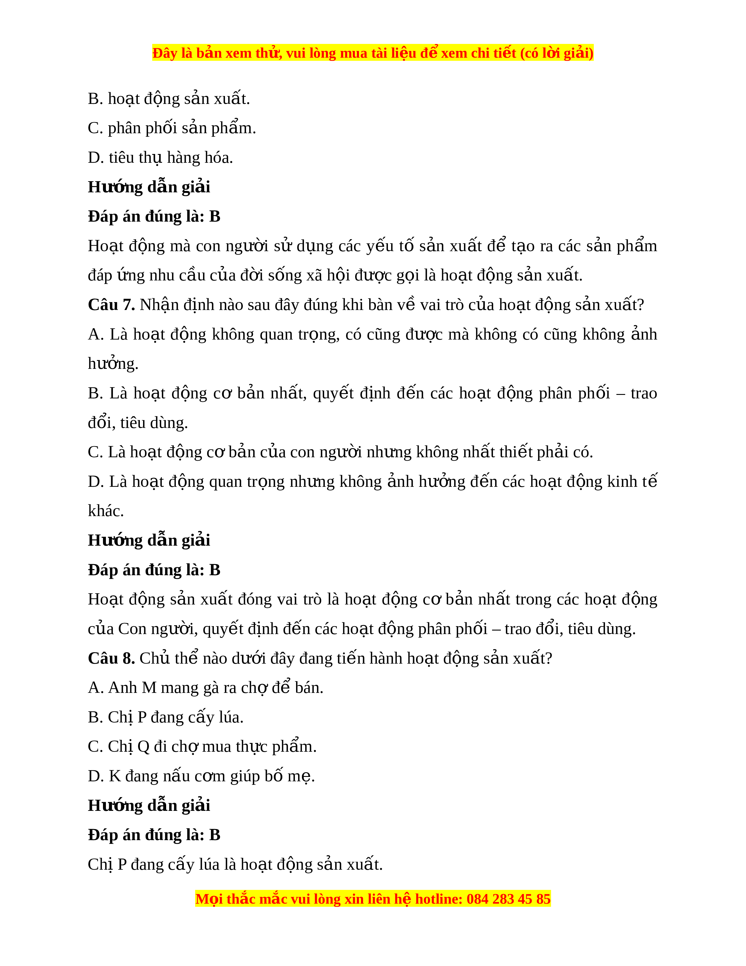 Đây là bản xem th , vu ử i lòng mua tài li u ệ đ xe ể m chi ti t (c ế ó l i ờ gi i ả ) B. ho t ạ đ ng s ộ n xu ả t ấ . C. phân ph i ố s n ph ả m ẩ . D. tiêu th hàng ụ hóa. Hư ng d ớ ẫn gi i ả Đáp án đúng là: B Ho t ạ đ ng ộ mà con ngư i ờ sử d ng ụ các y u ế tố s n ả xu t ấ để t o ạ ra các s n ả ph m ẩ đáp ng ứ nhu cầu c a đ ủ i ờ sống xã h i ộ đư c g ợ i ọ là ho t ạ đ ng s ộ n xu ả t ấ . Câu 7. Nh n ậ đ nh nào s ị au đây đúng khi bàn v vai ề trò c a ủ ho t ạ đ ng ộ s n ả xu t ấ ? A. Là ho t ạ đ ng ộ không quan tr ng, ọ có cũng đư c