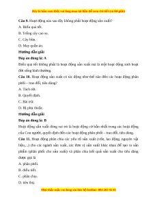 ợ mà không có cũng không nh ả hư ng. ở B. Là ho t ạ đ ng ộ cơ b n ả nh t ấ , quy t ế đ nh ị đ n ế các ho t ạ đ ng ộ phân ph i ố – trao đổi, tiêu dùng. C. Là ho t ạ đ ng c ộ b ơ n ả c a con ủ ngư i ờ nh ng không nh ư t ấ thi t ế ph i ả có. D. Là ho t ạ đ ng ộ quan tr ng ọ nh ng ư không nh ả hư ng ở đ n ế các ho t ạ đ ng ộ kinh tế khác. Hư ng d ớ ẫn gi i ả Đáp án đúng là: B Ho t ạ đ ng ộ s n ả xu t ấ đóng vai trò là ho t ạ đ ng ộ cơ b n ả nh t ấ trong các ho t ạ đ ng ộ c a ủ Con ngư i ờ , quy t ế đ nh đ ị n ế các ho t ạ đ ng ộ phân ph i ố – trao đ i ổ , tiêu dùng. Câu 8. Chủ th nào d ể ư i ớ đây đang ti n hành ho ế t ạ đ ng ộ s n ả xu t ấ ?