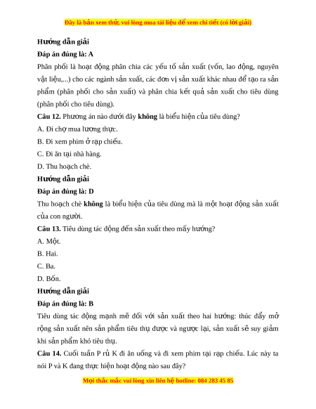 Đây là bản xem th , vu ử i lòng mua tài li u ệ đ xe ể m chi ti t (c ế ó l i ờ gi i ả ) Câu 9. Ho t ạ đ ng nào s ộ au đây không ph i ả ho t ạ đ ng s ộ n xu ả t ấ ? A. Bi u ế quà t t ế . B. Trồng cây cao su. C. Cày b a. ừ D. May qu n áo. ầ Hư ng d ớ ẫn gi i ả Đáp án đúng là: A Bi u ế quà t t ế không ph i ả là ho t ạ đ ng ộ s n ả xu t ấ mà là m t ộ ho t ạ đ ng ộ sinh ho t ạ đ i ờ sống bình thư ng. ờ Câu 10. Ho t ạ đ ng ộ s n ả xu t ấ có tác đ ng ộ như thế nào đ n ế các ho t ạ đ ng ộ phân phối – trao đ i ổ , tiêu dùng? A. Tách r i ờ . B. Quy t ế đ nh. ị C. Bài tr . ừ D. Bị ph t ụ hu c. ộ Hư ng d ớ ẫn gi i ả Đáp án đúng là: B Ho t ạ đ ng ộ s n ả xu t ấ đóng vai trò là ho t ạ đ ng ộ cơ b n ả nh t ấ trong các ho t ạ đ ng ộ c a ủ Con ngư i ờ , quy t ế đ nh đ ị n ế các ho t ạ đ ng ộ phân ph i ố – trao đ i ổ , tiêu dùng. Câu 11. Ho t ạ đ ng ộ phân chia các y u ế tố s n ả xu t ấ (v n, ố lao đ ng, ộ nguyên v t ậ li u,...) ệ cho các ngành s n ả xu t ấ , các đ n ơ vị s n ả xu t ấ khác nhau để t o ạ ra s n ả phẩm (phân ph i ố cho s n ả xu t ấ ) và phân chia k t ế quả s n ả xu t ấ cho tiêu dùng đư c ợ g i ọ là A. phân phối. B. đi u t ề i t ế . C. phân chia. D. tiêu th . ụ M i
