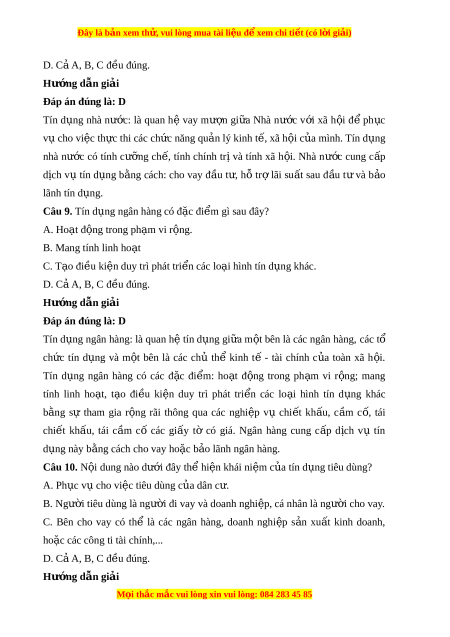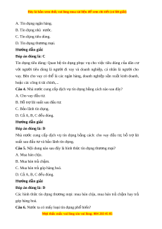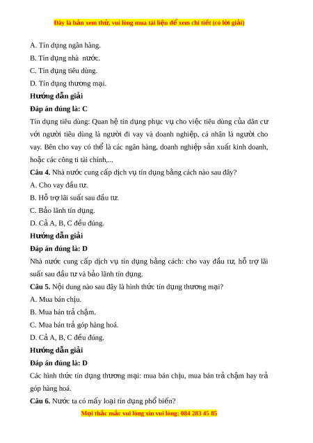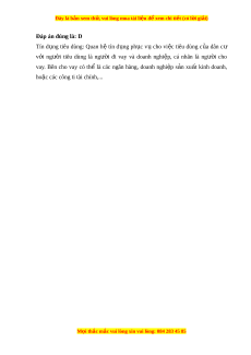 Đây là bản xem th , vu ử i lòng mua tài li u ệ đ xe ể m chi ti t ế (có l i ờ gi i ả ) A. 3. B. 4. C. 5. D. 6. Hư ng ớ d n gi ẫ i ả Đáp án đúng là: B Nư c t ớ a có 4 lo i ạ d ch v ị t ụ ín d ng ph ụ bi ổ n g ế m ồ : - Tín d ng t ụ hư ng ơ m i ạ - Tín d ng nhà ụ nư c ớ - Tín d ng ngân ụ hàng - Tín d ng t ụ iêu dùng Câu 7. N i ộ dung nào dư i ớ đây th hi ể n đ ệ c đi ặ m ể c a ủ tín d ng t ụ hư ng m ơ i ạ ? A. Do các doanh nghi p, t ệ ổ ch c ứ kinh t , doanh nhân ế c p cho nhau. ấ B. Không có s t ự ham gia c a ủ h t ệ h ng ngân hàng. ố C. Làm gi m ả sự l t ệ hu c ộ v v ề n vào N ố hà nư c ớ và các ngân hàng. D. Cả A, B, C đúng. Hư ng ớ d n gi ẫ i ả Đáp án đúng là: D Tín d ng ụ thư ng ơ m i ạ là quan hệ tín d ng ụ do các doanh nghi p, ệ tổ ch c ứ kinh t , ế doanh nhân c p