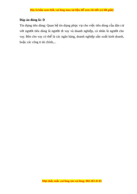 Đây là bản xem th , vu ử i lòng mua tài li u ệ đ xe ể m chi ti t (c ế ó l i ờ gi i ả ) A. Tín d ng ngân ụ hàng. B. Tín d ng nhà ụ nư c. ớ C. Tín d ng t ụ iêu dùng. D. Tín d ng t ụ hư ng ơ m i ạ . Hư ng d ớ ẫn gi i ả Đáp án đúng là: C Tín d ng ụ tiêu dùng: Quan h ệ tín d ng ụ ph c ụ v ụ cho vi c ệ tiêu dùng c a ủ dân cư v i ớ ngư i ờ tiêu dùng là ngư i ờ đi vay và doanh nghi p, ệ cá nhân là ngư i ờ cho