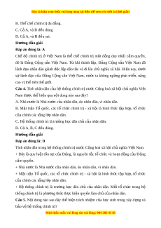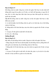 ể cá nhân phụ trách; nguyên t c ắ pháp chế xã h i ộ chủ nghĩa. Câu 2. Bộ ph n nào ậ đư c xem ợ là tr c ụ t ộ c a ủ h t ệ h ng chí ố nh tr ị n ở ư c t ớ a? A. Quốc h i ộ . B. Đ ng C ả ng ộ s n ả Vi t ệ Nam. C. Nhà nư c ớ C ng hòa xã ộ h i ộ ch nghĩ ủ a Vi t ệ Nam. D. M t ặ tr n ậ Tổ quốc Vi t ệ Nam. Hư ng d ớ ẫn gi i ả Đáp án đúng là: C Nhà nư c ớ C ng ộ hòa xã h i ộ ch nghĩ ủ a Vi t ệ Nam: là tr c ụ t ộ c a ủ h ệ th ng ố chính tr ị ở nư c