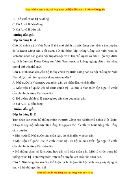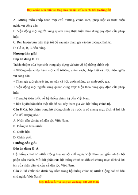 Đây là bản xem th , vu ử i lòng mua tài li u ệ đ xe ể m chi ti t ế (có l i ờ gi i ả ) A. Gư ng ơ m u ẫ ch p ấ hành m i ọ chủ trư ng, ơ chính sách, pháp lu t ậ và th c ự hi n ệ nghĩa vụ công dân. B. V n ậ đ ng ộ m i ọ ngư i ờ xung quanh cùng th c ự hi n ệ theo đúng quy đ nh ị c a ủ pháp lu t ậ . C. Rèn luy n b ệ n ả thân th t ậ t t ố đ s ể au này tham gia vào h t ệ h ng chí ố nh tr . ị D. C ả A, B, C đ u ề đúng. Hư ng d ớ ẫn gi i ả Đáp án đúng là: D Trách nhi m ệ c a ủ h c s ọ inh trong xây d ng ự và b o v ả h ệ t ệ h ng chí ố nh tr : ị + Gư ng ơ m u ẫ ch p ấ hành m i ọ ch ủ trư ng, ơ chính sách, pháp lu t ậ và th c ự hi n ệ nghĩa v công ụ dân. + Tham gia gi gì ữ n tr t ậ t , an ự toàn xã h i ộ , qu c phòng, an ni ố nh qu c gi ố a. + V n ậ đ ng ộ m i ọ ngư i ờ xung quanh cùng th c ự hi n ệ theo đúng quy đ nh ị c a ủ pháp lu t ậ . + Trang b ki ị n t ế h c v ứ h ề t ệ h ng chí ố nh tr c ị a ủ Vi t ệ Nam. + Rèn luy n b ệ n t ả hân th t ậ t t ố đ s ể au này tham gia vào h t ệ h ng chí ố nh tr . ị Câu 6. Các bộ ph n ậ trong hệ th ng ố chính trị nư c ớ ta có chung m c ụ đích vì l i ợ ích c a ủ đối tư ng ợ nào? A. Nhân dân và c a c ủ dân t ả c ộ Vi t ệ Nam. B. Đ ng và N ả hà nư c. ớ C. Quốc h i ộ . D. Chính ph . ủ Hư ng d ớ ẫn gi i ả Đáp án đúng là: A