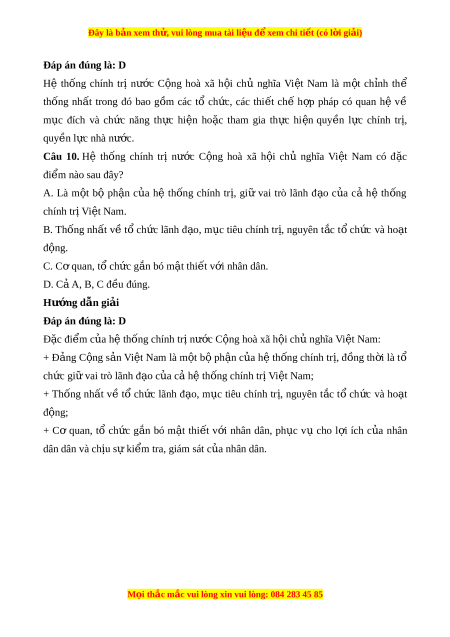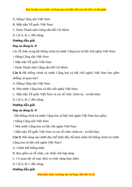 Đây là bản xem th , vu ử i lòng mua tài li u ệ đ xe ể m chi ti t ế (có l i ờ gi i ả ) A. Đ ng ả C ng ộ s n ả Vi t ệ Nam. B. M t ặ tr n ậ T qu ổ c ố Vi t ệ Nam. C. Đoàn Thanh niên C ng ộ s n ả H C ồ hí Minh. D. C ả A, B, C đ u ề đúng. Hư ng d ớ ẫn gi i ả Đáp án đúng là: D Các tổ ch c t ứ rong h t ệ hống chính tr n ị ư c ớ C ng ộ hoà xã h i ộ ch nghĩ ủ a Vi t ệ Nam: + Đ ng ả C ng s ộ n ả Vi t ệ Nam + M t ặ tr n ậ T qu ổ c ố Vi t ệ Nam + Đoàn Thanh niên C ng s ộ n H ả C ồ hí Minh Câu 8. Hệ th ng ố chính trị nư c ớ C ng ộ hoà xã h i ộ chủ nghĩa Vi t ệ Nam bao g m ồ nh ng c ữ ơ quan nào? A. Đ ng ả C ng ộ s n ả Vi t ệ Nam. B. Nhà nư c ớ C ng hòa xã ộ h i ộ ch nghĩ ủ a Vi t ệ Nam. C. M t ặ tr n ậ T qu ổ c ố Vi t ệ Nam và các t ch ổ c ứ chính tr - ị xã h i ộ khác. D. C ả A, B, C đ u ề đúng. Hư ng d ớ ẫn gi i ả Đáp án đúng là: D - H t ệ hống chính tr n ị ư c C ớ ng ộ hòa xã h i ộ chủ nghĩa Vi t ệ Nam bao g m ồ : + Đ ng ả C ng s ộ n ả Vi t ệ Nam + Nhà nước C ng ộ hòa xã h i ộ chủ nghĩa Vi t ệ Nam + M t ặ tr n ậ T qu ổ c ố Vi t ệ Nam và các t ch ổ c chí ứ nh tr - ị xã h i ộ khác. Câu 9. N i ộ dung nào dư i ớ đây thể hi n ệ đ y ầ đ ủ khái ni m ệ h ệ th ng ố chính tr ịnư c ớ C ng ộ hoà xã h i ộ chủ nghĩa Vi t ệ Nam? A. Chỉnh thể th ng nh ố t ấ .