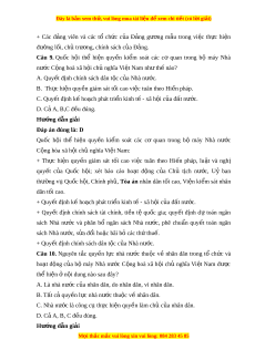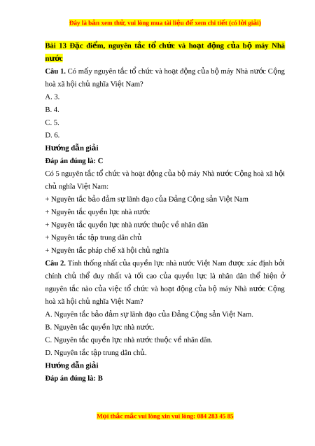 Đây là bản xem th , vu ử i lòng mua tài li u ệ đ xe ể m chi ti t ế (có l i ờ gi i ả ) Bài 13 Đ c ặ đi m ể , nguyên t c ắ tổ ch c ứ và ho t ạ đ ng ộ c a ủ bộ máy Nhà nư c ớ Câu 1. Có m y ấ nguyên t c ắ t ổ ch c ứ và ho t ạ đ ng ộ c a ủ b ộ máy Nhà nư c ớ C ng ộ hoà xã h i ộ chủ nghĩa Việt Nam? A. 3. B. 4. C. 5. D. 6. Hư ng ớ d n gi ẫ i ả Đáp án đúng là: C Có 5 nguyên t c ắ t ổ ch c ứ và ho t ạ đ ng ộ c a ủ b ộ máy Nhà nư c ớ C ng ộ hoà xã h i ộ ch nghĩ ủ a Việt Nam: + Nguyên t c ắ b o đ ả m ả s l ự ãnh đ o ạ c a Đ ủ ng ả C ng s ộ n ả Vi t ệ Nam + Nguyên t c ắ quy n l ề c nhà n ự ư c ớ + Nguyên t c ắ quy n l ề c nhà n ự ư c ớ thu c v ộ nhân dân ề + Nguyên t c ắ t p t ậ rung dân chủ + Nguyên t c ắ pháp ch xã h ế i ộ chủ nghĩa Câu 2. Tính th ng ố nh t ấ c a ủ quy n ề l c ự nhà nư c ớ Vi t ệ Nam đư c ợ xác đ nh ị b i ở chính chủ thể duy nh t ấ và t i ố cao c a ủ quy n ề l c ự là nhân dân thể hi n ệ ở nguyên tắc nào c a ủ vi c ệ tổ ch c ứ và ho t ạ đ ng ộ c a ủ bộ máy Nhà nư c ớ C ng ộ hoà xã h i ộ chủ nghĩa Việt Nam? A. Nguyên t c ắ b o đ ả m ả s l ự ãnh đ o ạ c a Đ ủ ng ả C ng ộ s n ả Vi t ệ Nam. B. Nguyên tắc quy n l ề c nhà ự nư c. ớ C. Nguyên tắc quy n l ề c nhà ự nư c t ớ hu c ộ v nhân dân. ề D. Nguyên t c ắ t p t ậ rung dân ch . ủ Hư ng ớ d n gi ẫ i ả Đáp án đúng là: B M i