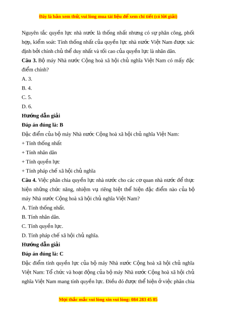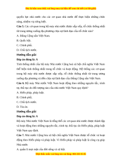 Câu 3. Bộ máy Nhà nư c ớ C ng ộ hoà xã h i ộ chủ nghĩa Vi t ệ Nam có m y ấ đ c ặ đi m ể chính? A. 3. B. 4. C. 5. D. 6. Hư ng d ớ ẫn gi i ả Đáp án đúng là: B Đặc đi m ể c a ủ b m ộ áy Nhà nư c ớ C ng hoà ộ xã h i ộ ch nghĩ ủ a Vi t ệ Nam: + Tính th ng nh ố t ấ + Tính nhân dân + Tính quy n l ề c ự + Tính pháp chế xã h i ộ ch nghĩ ủ a