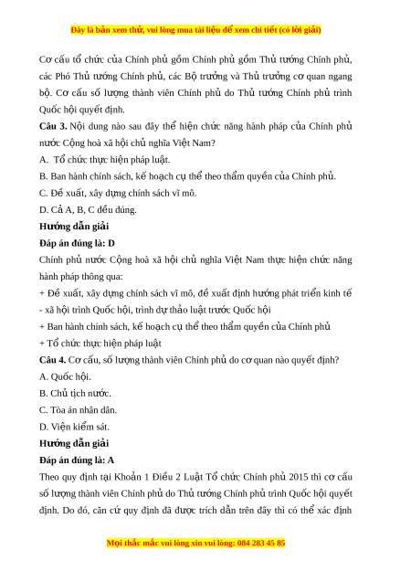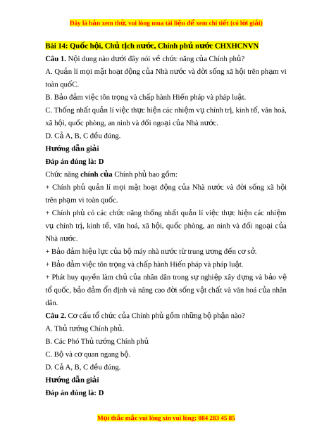 Đây là bản xem th , vu ử i lòng mua tài li u ệ đ xe ể m chi ti t ế (có l i ờ gi i ả ) Bài 14: Quốc h i ộ , Ch t ủ ch n ị ư c, ớ Chính ph n ủ ư c ớ CHXHCNVN Câu 1. N i ộ dung nào dư i ớ đây nói v ch ề c năng c ứ a ủ Chính ph ? ủ A. Qu n ả lí m i ọ m t ặ ho t ạ đ ng ộ c a ủ Nhà nư c ớ và đ i ờ s ng ố xã h i ộ trên ph m ạ vi toàn quốC. B. B o đ ả m ả vi c t ệ ôn tr ng và ch ọ p hành H ấ i n ế pháp và pháp lu t ậ . C. Thống nh t ấ qu n ả lí vi c ệ th c ự hi n ệ các nhi m ệ v ụ chính tr , ị kinh t , ế văn hoá, xã h i