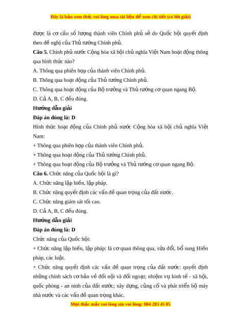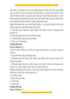 ợ thành viên Chính phủ sẽ do Qu c ố h i ộ quy t ế đ nh ị theo đ ngh ề ị c a ủ Th t ủ ư ng ớ Chính ph . ủ Câu 5. Chính ph n ủ ư c ớ C ng ộ hòa xã h i ộ ch nghĩ ủ a Vi t ệ Nam ho t ạ đ ng t ộ hông qua hình th c nào? ứ A. Thông qua phiên h p c ọ a ủ thành viên Chính ph . ủ B. Thông qua ho t ạ đ ng c ộ a ủ Th t ủ ư ng C ớ hính ph . ủ C. Thông qua ho t ạ đ ng c ộ a ủ B t ộ rư ng và ở Th t ủ ư ng ớ c quan ngang ơ B . ộ D. Cả A, B, C đ u đúng. ề Hư ng ớ d n gi ẫ i ả Đáp án đúng là: D Hình th c ứ ho t ạ đ ng ộ c a ủ Chính phủ nư c ớ C ng ộ hòa xã h i ộ chủ nghĩa Vi t ệ Nam: + Thông qua phiên h p c ọ a ủ thành viên Chính ph . ủ + Thông qua ho t ạ đ ng ộ c a ủ Th t ủ ư ng ớ Chính ph . ủ + Thông qua ho t ạ đ ng ộ c a B ủ ộ trư ng ở và Th t ủ ư ng c ớ quan ngang B ơ . ộ Câu 6. Ch c ứ năng c a Q ủ uốc h i ộ là gì? A. Ch c ứ năng l p hi ậ n, l ế p ậ pháp. B. Ch c ứ năng quy t ế đ nh các v ị n đ ấ quan ề tr ng c ọ a ủ đ t ấ nư c. ớ C. Ch c