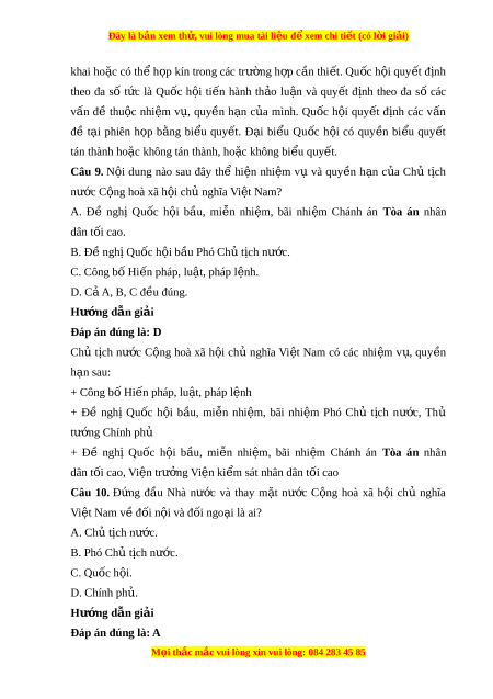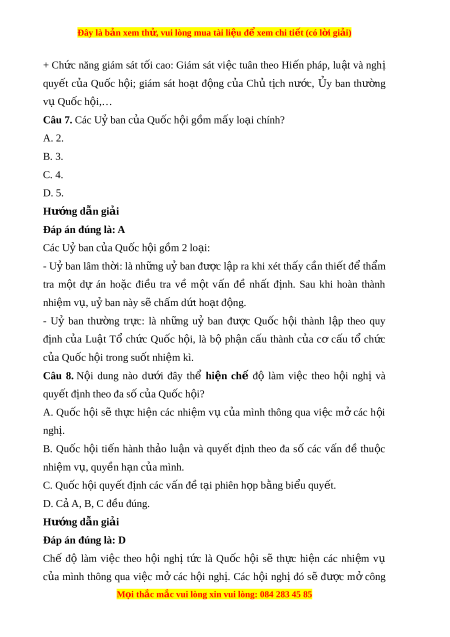 Đây là bản xem th , vu ử i lòng mua tài li u ệ đ xe ể m chi ti t (c ế ó l i ờ gi i ả ) + Ch c ứ năng giám sát t i ố cao: Giám sát vi c ệ tuân theo Hi n ế pháp, lu t ậ và nghị quy t ế c a ủ Qu c ố h i ộ ; giám sát ho t ạ đ ng ộ c a ủ Chủ t ch ị nư c, ớ y Ủ ban thư ng ờ v Q ụ uốc h i ộ ,… Câu 7. Các U ban c ỷ a ủ Quốc h i ộ g m ồ m y l ấ o i ạ chính? A. 2. B. 3. C. 4. D. 5. Hư ng d ớ ẫn gi i ả Đáp án đúng là: A Các U ban c ỷ a ủ Quốc h i ộ g m ồ 2 lo i ạ : - U ban l ỷ âm th i ờ : là nh ng u ữ ỷ ban đư c l ợ p ậ ra khi xét th y c ấ n t ầ hi t ế đ t ể h m ẩ tra m t ộ dự án ho c ặ đi u ề tra về m t ộ v n ấ đề nh t ấ đ nh. ị Sau khi hoàn thành nhiệm v , u ụ ban này ỷ s ch ẽ m ấ d t ứ ho t ạ đ ng. ộ - Uỷ ban thư ng ờ tr c: ự là nh ng ữ uỷ ban đư c ợ Qu c ố h i ộ thành l p ậ theo quy định c a ủ Lu t ậ Tổ ch c ứ Qu c ố h i ộ , là bộ ph n ậ c u ấ thành c a ủ cơ c u ấ tổ ch c ứ c a ủ Quốc h i ộ trong suốt nhi m ệ kì. Câu 8. N i ộ dung nào dư i ớ đây thể hi n