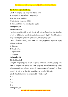 Câu 1. Vì sao pháp lu t ậ mang b n ả ch t ấ xã h i ộ ? A. b t ắ nguồn t t ừ h c t ự i n đ ễ i ờ sống xã h i ộ . B. do Nhà nước ban hành. C. luôn tồn t i ạ trong m i ọ xã h i ộ . D. ph n ánh ả l i ợ ích c a gi ủ ai c p c ấ m ầ quy n. ề Hư ng ớ d n gi ẫ i ả Đáp án đúng là: A Pháp lu t ậ mang b n ả ch t ấ xã h i ộ vì pháp lu t ậ b t ắ ngu n ồ t ừ th c ự ti n ễ đ i ờ s ng ố xã h i ộ , nó là hệ th ng ố quy t c ắ ng ứ x ử c a ủ con ngư i ờ , là phép đ i ố nhân x ử thế trong quan hệ gi a ữ ngư i ờ v i ớ ngư i ờ trong đ i ờ s ng hàng ngày ố . Câu 2. Để qu n ả lí xã h i ộ , Nhà nư c ớ c n ầ sử d ng ụ phư ng ơ ti n ệ quan tr ng ọ nh t ấ nào dư i ớ đây? A. Giáo d c. ụ B. Thuy t ế ph c. ụ C. Tuyên truy n. ề D. Pháp lu t ậ . Hư ng ớ d n gi ẫ i ả Đáp án đúng là: D Trong đ i ờ s ng ố xã h i ộ , vai trò c a ủ pháp lu t ậ đư c ợ xem xét t ừ hai góc đ : ộ Nhà nư c ớ và công dân. T ừ góc đ ộ Nhà nư c, ớ pháp lu t ậ là c ơ s ở đ ể thi t ế l p, ậ c ng ủ cố và tăng cư ng ờ quy n ề l c ự Nhà nư c, ớ phư ng ơ ti n ệ để Nhà nư c ớ qu n ả lý kinh t - ế xã h i ộ , c s ơ ở cho vi c ho ệ t ạ đ ng ộ c a b ủ m ộ áy Nhà nư c. ớ Câu 3. Pháp lu t ậ có m y vai ấ trò chính đ i ố v i ớ đ i ờ s ng? ố A. 2. B. 3. C. 4. D. 5. Hư ng ớ d n gi ẫ i ả M i