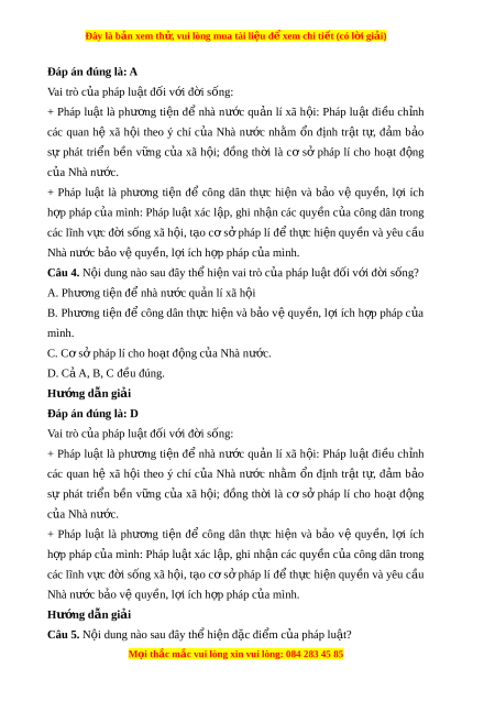 Đây là bản xem th , vu ử i lòng mua tài li u ệ đ xe ể m chi ti t (c ế ó l i ờ gi i ả ) Đáp án đúng là: A Vai trò c a ủ pháp lu t ậ đ i ố v i ớ đ i ờ s ng: ố + Pháp lu t ậ là phư ng ơ ti n ệ để nhà nư c ớ qu n ả lí xã h i ộ : Pháp lu t ậ đi u ề ch nh ỉ các quan hệ xã h i ộ theo ý chí c a ủ Nhà nư c ớ nh m ằ n ổ đ nh ị tr t ậ t , ự đ m ả b o ả sự phát tri n ể b n ề v ng ữ c a ủ xã h i ộ ; đ ng ồ th i
