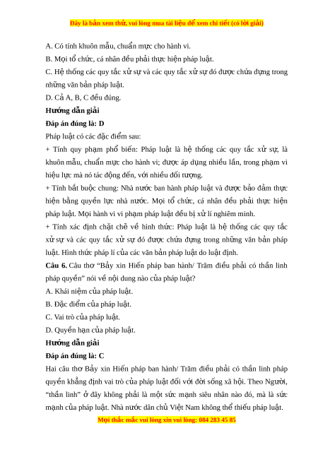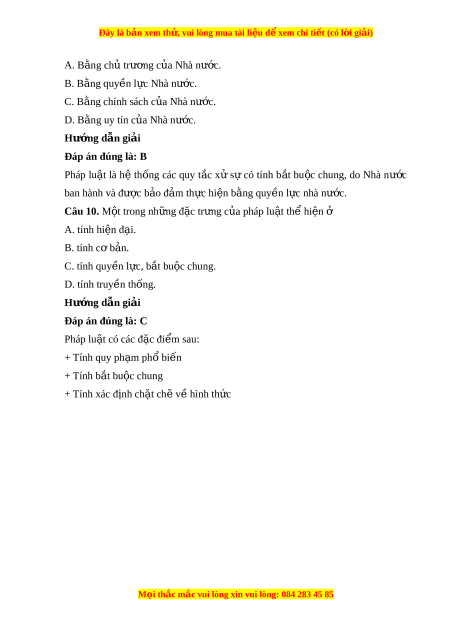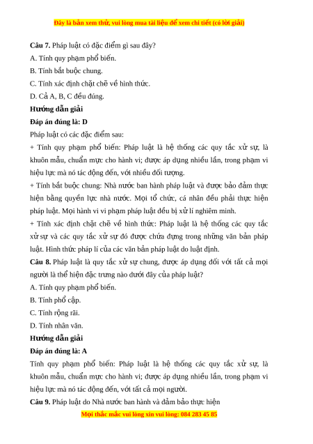 Đây là bản xem th , vu ử i lòng mua tài li u ệ đ xe ể m chi ti t (c ế ó l i ờ gi i ả ) Câu 7. Pháp lu t ậ có đ c đi ặ m ể gì sau đây? A. Tính quy ph m ạ phổ bi n. ế B. Tính b t ắ bu c chung. ộ C. Tính xác đ nh ch ị t ặ ch v ẽ hì ề nh th c. ứ D. C ả A, B, C đ u ề đúng. Hư ng d ớ ẫn gi i ả Đáp án đúng là: D Pháp lu t ậ có các đ c ặ đi m ể sau: + Tính quy ph m ạ phổ bi n: ế Pháp lu t ậ là hệ th ng ố các quy t c ắ xử s , ự là khuôn mẫu, chuẩn m c ự cho hành vi; đư c ợ áp d ng ụ nhi u ề l n, ầ trong ph m ạ vi hiệu l c m ự à nó tác đ ng đ ộ n, v ế i ớ nhi u đ ề i ố tư ng. ợ + Tính b t ắ bu c ộ chung: Nhà nư c ớ ban hành pháp lu t ậ và đư c ợ b o ả đ m ả th c ự hiện b ng ằ quy n ề l c ự nhà nư c. ớ M i ọ tổ ch c, ứ cá nhân đ u ề ph i ả th c ự hi n ệ pháp lu t ậ . M i ọ hành vi vi ph m ạ pháp lu t ậ đ u ề b x ị l ử í nghiêm minh. + Tính xác đ nh ị ch t ặ chẽ về hình th c: ứ Pháp lu t ậ là hệ th ng ố các quy t c ắ xử sự và các quy t c ắ xử sự đó đư c ợ ch a ứ đ ng ự trong nh ng ữ văn b n ả pháp lu t ậ . Hình th c pháp l ứ í c a các ủ văn b n ả pháp lu t ậ do lu t ậ đ nh. ị Câu 8. Pháp lu t ậ là quy t c ắ xử sự chung, đư c ợ áp d ng ụ đ i ố v i ớ t t ấ cả m i ọ ngư i ờ là th hi ể n đ ệ c t ặ r ng nào d ư ư i ớ đây c a pháp l ủ u t ậ ? A. Tính quy ph m ạ phổ bi n. ế B. Tính ph c ổ p. ậ C. Tính r ng r ộ ãi. D. Tính nhân văn. Hư ng d ớ ẫn gi i ả Đáp án đúng là: A Tính quy ph m ạ phổ bi n: ế Pháp lu t ậ là hệ th ng ố các quy t c ắ xử s , ự là khuôn mẫu, chuẩn m c ự cho hành vi; đư c ợ áp d ng ụ nhi u ề l n, ầ trong ph m ạ vi hiệu l c m ự à nó tác đ ng đ ộ n, v ế i ớ t t ấ c m ả i ọ ngư i ờ . Câu 9. Pháp lu t ậ do Nhà nư c ban ớ hành và đ m ả b o ả th c hi ự n ệ M i ọ thắc m c