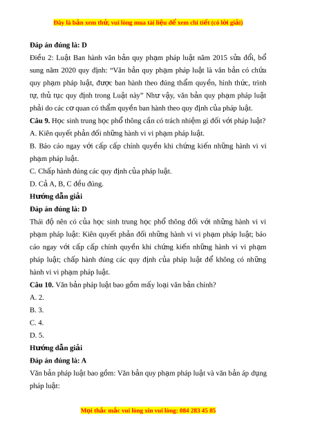 ả do các cơ quan có thẩm quy n ban hành t ề heo quy đ nh c ị a pháp ủ lu t ậ . Câu 9. H c ọ sinh trung h c ph ọ t ổ hông c n có t ầ rách nhi m ệ gì đ i ố v i ớ pháp lu t ậ ? A. Kiên quy t ế ph n đ ả i ố nh ng hành vi ữ vi ph m ạ pháp lu t ậ . B. Báo cáo ngay v i ớ c p ấ c p ấ chính quy n ề khi ch ng ứ ki n ế nh ng ữ hành vi vi ph m ạ pháp lu t ậ . C. Ch p hành đúng các ấ quy đ nh c ị a ủ pháp lu t ậ . D. C ả A, B, C đ u ề đúng. Hư ng d ớ ẫn gi i ả Đáp án đúng là: D Thái độ nên có c a ủ h c ọ sinh trung h c ọ phổ thông đ i ố v i ớ nh ng ữ hành vi vi ph m ạ pháp lu t ậ : Kiên quy t ế ph n ả đ i ố nh ng ữ hành vi vi ph m ạ pháp lu t ậ ; báo cáo ngay v i ớ c p ấ c p ấ chính quy n ề khi ch ng ứ ki n ế nh ng ữ hành vi vi ph m ạ pháp lu t ậ ; ch p
