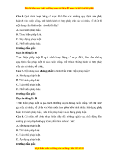 Câu 6. Quá trình ho t ạ đ ng ộ có m c ụ đích làm cho nh ng ữ quy đ nh ị c a ủ pháp lu t ậ đi vào cu c ộ s ng, ố trở thành hành vi h p ợ pháp c a ủ các cá nhân, t ổ ch c ứ là n i ộ dung c a khái ủ ni m ệ nào dư i ớ đây? A. Ban hành pháp lu t ậ . B. Th c ự hi n pháp l ệ u t ậ . C. Xây d ng ự pháp lu t ậ . D. Phổ bi n pháp ế lu t ậ . Hư ng ớ d n gi ẫ i ả Đáp án đúng là: B Th c ự hi n ệ pháp lu t ậ là quá trình ho t ạ đ ng ộ có m c ụ đích, làm cho nh ng ữ quy định c a ủ pháp lu t ậ đi vào cu c ộ s ng, ố trở thành nh ng ữ hành vi h p ợ pháp c a các ủ cá nhân, tổ ch c. ứ Câu 7. N i