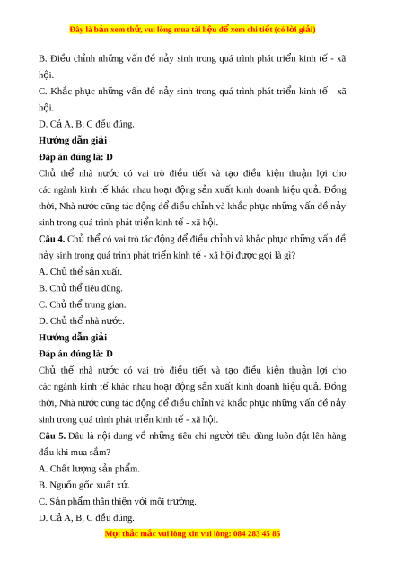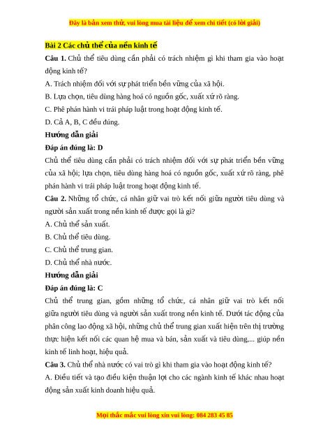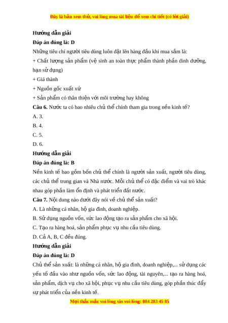 Đây là bản xem th , vu ử i lòng mua tài li u ệ đ xe ể m chi ti t ế (có l i ờ gi i ả ) Hư ng ớ d n gi ẫ i ả Đáp án đúng là: D Nh ng t ữ iêu chí ngư i ờ tiêu dùng luôn đ t ặ lên hàng đ u khi ầ mua s m ắ là: + Ch t ấ lư ng ợ s n ả ph m ẩ (vệ sinh an toàn th c ự ph m ẩ thành ph n ầ dinh dư ng, ỡ h n s ạ ử d ng) ụ + Giá thành + Nguồn gốc xu t ấ xứ + S n ph ả m ẩ có thân thi n v ệ i ớ môi trư ng ờ hay không Câu 6. Nư c t ớ a có bao nhiêu ch t ủ h chí ể nh tham gia trong n n ki ề nh t ? ế A. 3. B. 4. C. 5. D. 6. Hư ng ớ d n gi ẫ i ả Đáp án đúng là: B N n ề kinh tế bao g m ồ b n