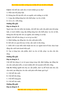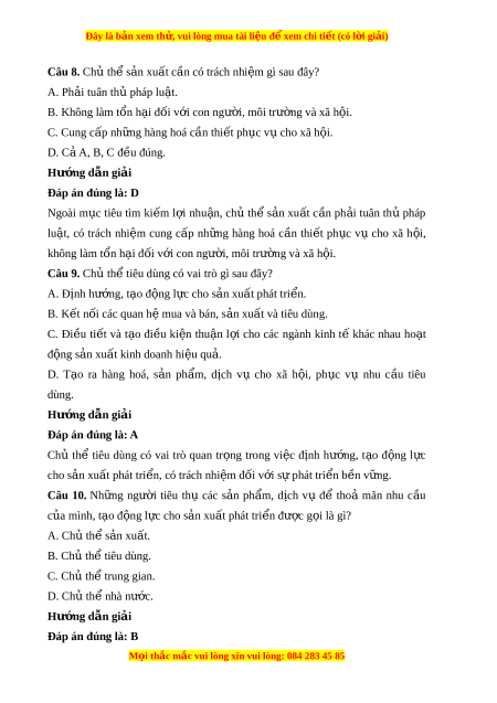 Đây là bản xem th , vu ử i lòng mua tài li u ệ đ xe ể m chi ti t (c ế ó l i ờ gi i ả ) Câu 8. Chủ th s ể n ả xu t ấ c n có t ầ rách nhi m ệ gì sau đây? A. Ph i ả tuân th pháp l ủ u t ậ . B. Không làm t n h ổ i ạ đ i ố v i ớ con ngư i ờ , môi trư ng ờ và xã h i ộ . C. Cung c p nh ấ ng hàng hoá ữ c n t ầ hi t ế ph c ụ v cho xã h ụ i ộ . D. C ả A, B, C đ u ề đúng. Hư ng d ớ ẫn gi i ả Đáp án đúng là: D Ngoài m c ụ tiêu tìm ki m ế l i ợ nhu n, ậ ch ủ th ể s n ả xu t ấ c n ầ ph i ả tuân th ủ pháp lu t ậ , có trách nhi m ệ cung c p ấ nh ng ữ hàng hoá c n ầ thi t ế ph c ụ vụ cho xã h i ộ , không làm tổn h i ạ đối v i ớ con ngư i ờ , môi trư ng và xã ờ h i ộ . Câu 9. Chủ th t