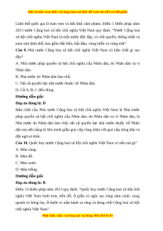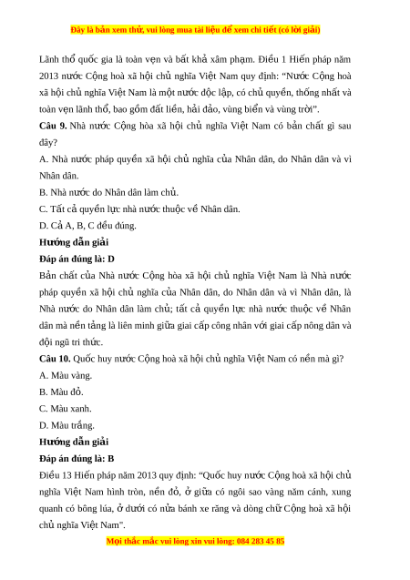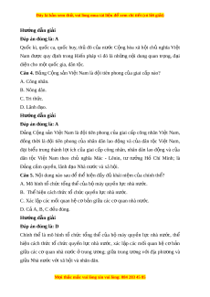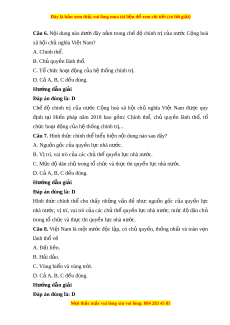 Đây là bản xem th , vu ử i lòng mua tài li u ệ đ xe ể m chi ti t (c ế ó l i ờ gi i ả ) Hư ng d ớ ẫn gi i ả Đáp án đúng là: A Quốc kì, qu c ố ca, qu c ố huy, th ủ đô c a ủ nư c ớ C ng ộ hòa xã h i ộ ch ủ nghĩa Vi t ệ Nam đư c ợ quy đ nh ị trong Hi n ế pháp vì đó là nh ng ữ n i ộ dung quan tr ng, ọ đ i ạ diện cho m t ộ quốc gia, dân t c. ộ Câu 4. Đ ng ả C ng ộ s n ả Vi t ệ Nam là đ i ộ tiên phong c a gi ủ ai c p nào? ấ A. Công nhân. B. Nông dân. C. Tri th c. ứ D. Lãnh đ o. ạ Hư ng d ớ ẫn gi i ả Đáp án đúng là: A Đ ng ả C ng ộ s n ả Vi t ệ Nam là đ i ộ tiên phong c a ủ giai c p ấ công nhân Vi t ệ Nam, đồng th i ờ là đ i ộ tiên phong c a ủ nhân dân lao đ ng ộ và c a ủ dân t c ộ Vi t ệ Nam, đ i ạ bi u ể trung thành l i ợ ích c a ủ giai c p