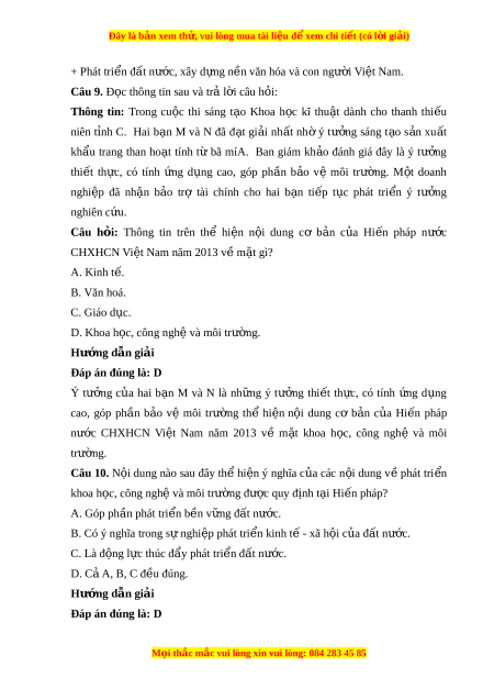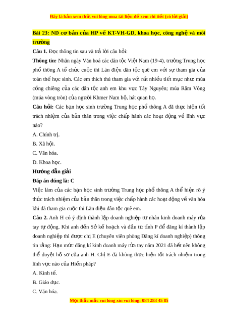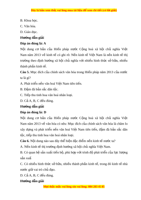 Đây là bản xem th , vu ử i lòng mua tài li u ệ đ xe ể m chi ti t ế (có l i ờ gi i ả ) B. Khoa h c. ọ C. Văn hóa. D. Giáo d c. ụ Hư ng ớ d n gi ẫ i ả Đáp án đúng là: A N i ộ dung cơ b n ả c a ủ Hi n ế pháp nư c ớ C ng ộ hoà xã h i ộ chủ nghĩa Vi t ệ