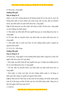 ủ chị E không đúng khi đã không duy t ệ hồ sơ c a ủ anh H, chị E đã không th c ự hi n ệ rõ trách nhi m ệ c a ủ mình trong vi c ệ u ư tiên, đ u ầ t , ư khuy n ế khích, t o ạ đi u ki ề n cho phát ệ tri n khoa ể h c, công ngh ọ . ệ Câu 3. N i ộ dung nào sau đây thu c ộ n i ộ dung cơ b n ả về khoa h c, ọ công nghệ và môi trư ng c ờ a ủ Hi n pháp? ế A. Nhà nư c ớ t o ạ đi u ề ki n ệ đ ể m i ọ ngư i ờ tham gia các ho t ạ đ ng ộ khoa h c ọ và công nghệ. B. u Ư tiên, đ u ầ t , ư khuy n ế khích, t o ạ đi u ề ki n ệ cho phát tri n ể khoa h c ọ và công nghệ. C. Nhà nư c ớ đ a ư ra chính sách b o ả vệ môi trư ng ờ nh m ằ qu n ả lí ngu n ồ tài nguyên thiên nhiên. D. C ả A, B, C đ u ề đúng. Hư ng d ớ ẫn gi i ả Đáp án đúng là: D Về khoa h c,