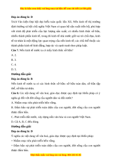 Đây là bản xem th , vu ử i lòng mua tài li u ệ đ xe ể m chi ti t (c ế ó l i ờ gi i ả ) Đáp án đúng là: D Trích Văn ki n ệ Đ i ạ h i ộ đ i ạ bi u ể toàn qu c ố l n ầ XII, N n ề kinh tế thị trư ng ờ định hư ng ớ xã h i ộ chủ nghĩa Vi t ệ Nam có quan h ệ s n ả xu t ấ ti n ế b , ộ phù h p ợ v i ớ trình độ phát tri n ể c a ủ l c ự lư ng ợ s n ả xu t ấ ; có nhi u ề hình th c ứ sở h u, ữ nhi u ề thành ph n ầ kinh t , ế trong đó kinh t ế nhà nư c ớ gi ữ vai trò ch ủ đ o, ạ kinh tế tư nhân là m t ộ đ ng ộ l c ự quan tr ng ọ c a ủ n n ề kinh t ; ế các ch ủ th ể thu c ộ các thành phần kinh t bì ế nh đ ng, ẳ h p t ợ ác và c nh ạ tranh theo pháp lu t ậ . Câu 7. N n ề kinh tế nư c t ớ a có mấy hình th c s ứ ở h u? ữ A. 2. B. 3. C. 4. D. 5. Hư ng d ớ ẫn gi i ả Đáp án đúng là: B N n ề kinh tế nư c ớ ta có các hình th c ứ sở h u: ữ sở h u ữ toàn dân, sở h u ữ t p ậ th , s ể h ở u t ữ nhân. ư Câu 8. Các n i