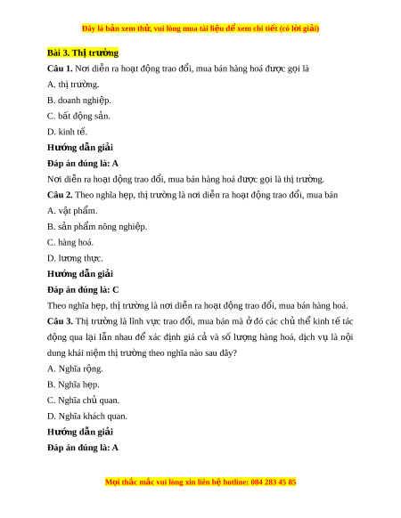 Câu 2. Theo nghĩa h p, t ẹ h t ị rư ng l ờ à n i ơ di n r ễ a ho t ạ đ ng ộ trao đ i ổ , mua bán A. v t ậ ph m ẩ . B. s n ả ph m ẩ nông nghi p. ệ C. hàng hoá. D. lư ng ơ th c. ự Hư ng d ớ ẫn gi i ả Đáp án đúng là: C Theo nghĩa h p, t ẹ h t ị rư ng l ờ à n i ơ di n r ễ a ho t ạ đ ng t ộ rao đ i ổ , mua bán hàng hoá. Câu 3. Thị trư ng ờ là lĩnh v c ự trao đ i ổ , mua bán mà ở đó các ch ủ th ể kinh t ế tác đ ng ộ qua l i ạ l n ẫ nhau để xác đ nh ị giá cả và số lư ng ợ hàng hoá, d ch ị vụ là n i ộ dung khái ni m ệ th t ị rư ng