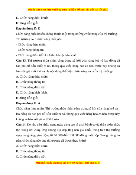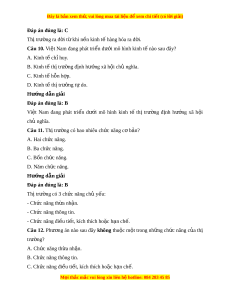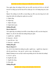 Câu 11. Thị trư ng có bao nhi ờ êu ch c ứ năng c b ơ n ả ? A. Hai ch c năng. ứ B. Ba ch c ứ năng. C. Bốn ch c năng. ứ D. Năm ch c năng. ứ Hư ng d ớ ẫn gi i ả Đáp án đúng là: B Th t ị rư ng có ờ 3 ch c năng ch ứ ủ y u: ế - Ch c ứ năng th a nh ừ n. ậ - Ch c ứ năng thông tin. - Ch c ứ năng đi u t ề i t ế , kích thích ho c ặ h n ch ạ . ế Câu 12. Phư ng