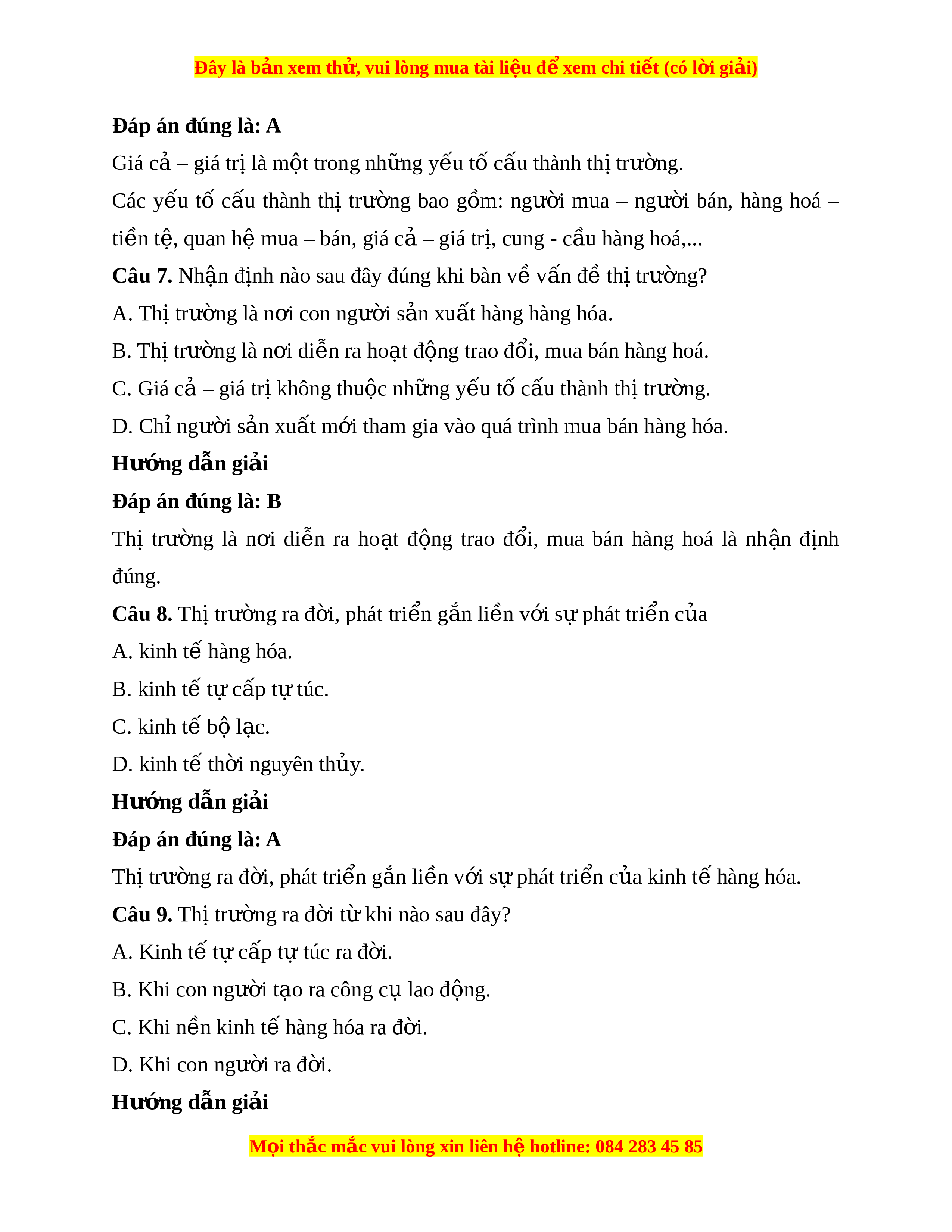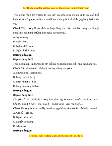 Đây là bản xem th , vu ử i lòng mua tài li u ệ đ xe ể m chi ti t (c ế ó l i ờ gi i ả ) Đáp án đúng là: A Giá c – gi ả á trị là m t ộ trong nh ng y ữ u t ế c ố u t ấ hành th t ị rư ng. ờ Các y u ế tố c u ấ thành thị trư ng ờ bao g m ồ : ngư i ờ mua – ngư i ờ bán, hàng hoá – ti n t ề , quan h ệ m ệ ua – bán, giá c – gi ả á tr , cung ị - c u hàng hoá,... ầ Câu 7. Nh n ậ đ nh nào s ị au đây đúng khi bàn v v ề n đ ấ t ề h t ị rư ng? ờ A. Thị trư ng l ờ à n i ơ con ngư i ờ s n ả xu t ấ hàng hàng hóa. B. Th t ị rư ng l ờ à n i ơ di n r ễ a ho t ạ đ ng t ộ rao đ i ổ , mua bán hàng hoá.