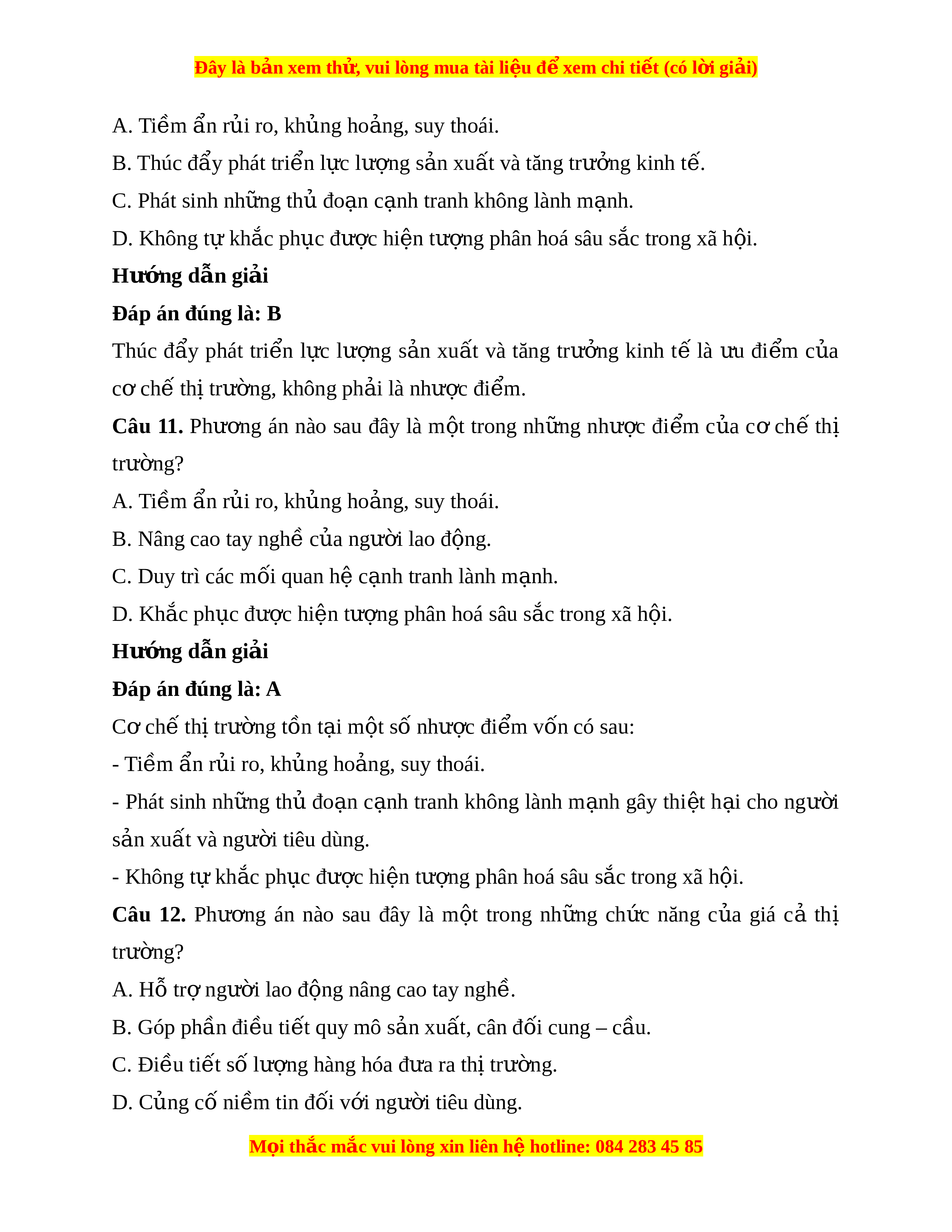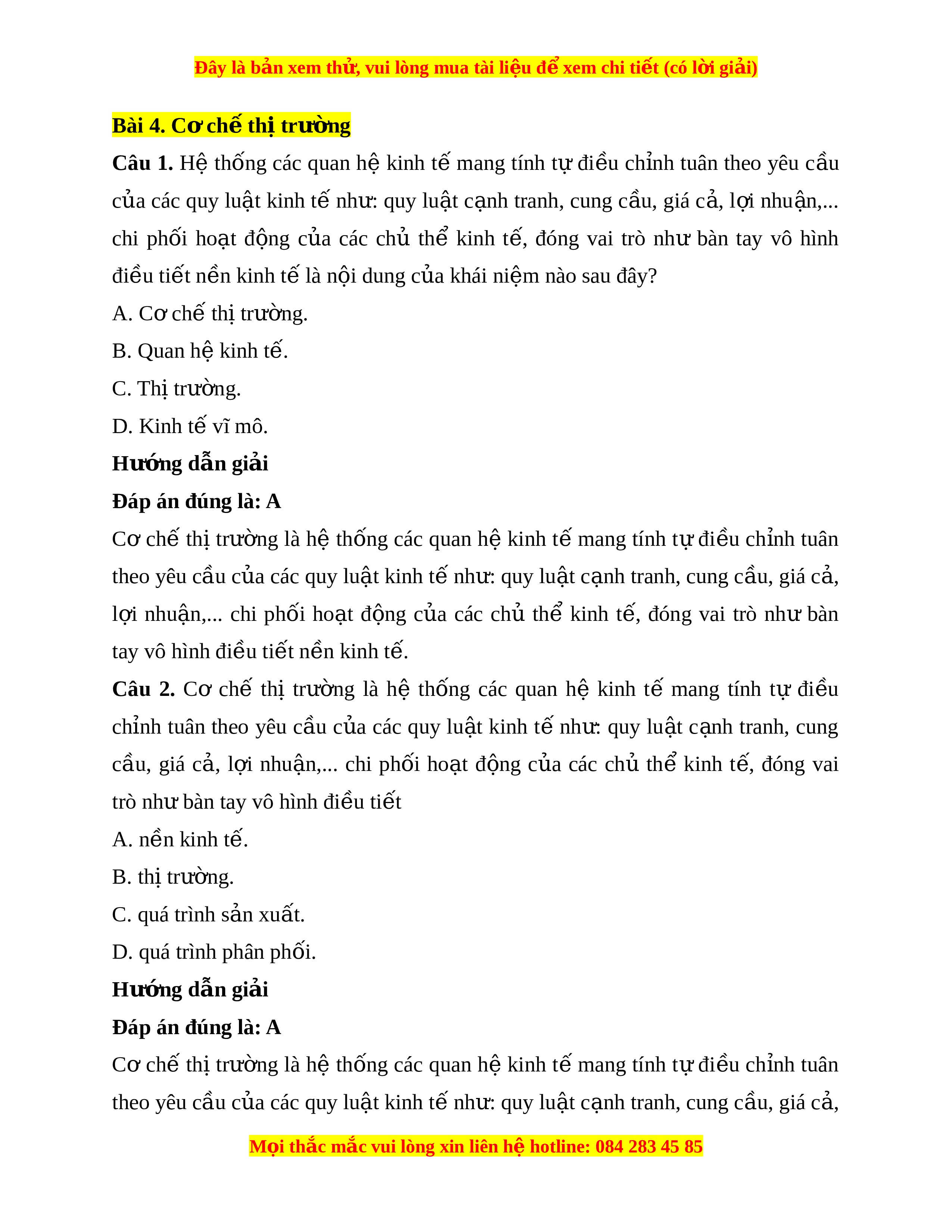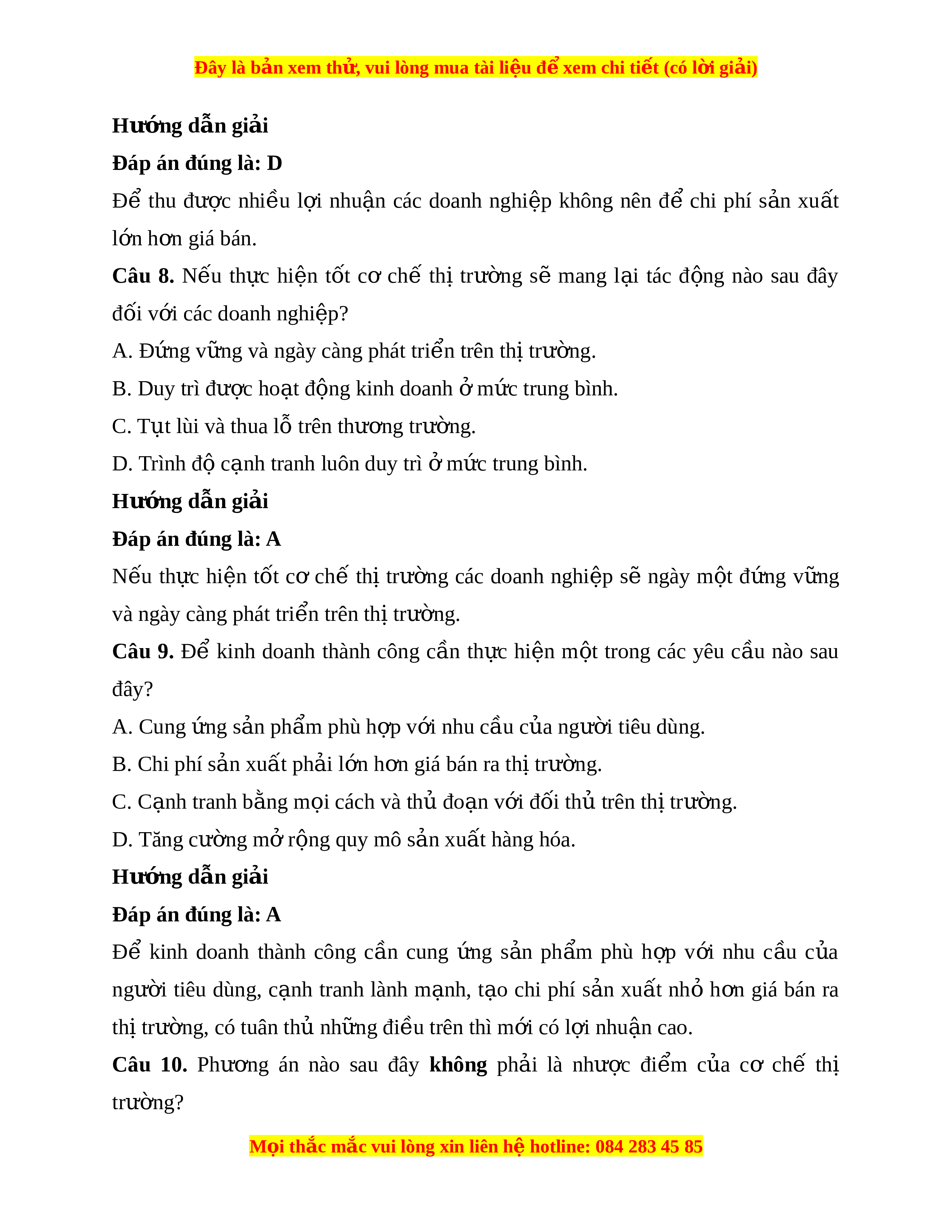 ệ không nên để chi phí s n ả xu t ấ l n h ớ n ơ giá bán. Câu 8. N u ế th c ự hi n ệ t t ố cơ chế thị trư ng ờ sẽ mang l i ạ tác đ ng ộ nào sau đây đối v i ớ các doanh nghi p? ệ A. Đ ng ứ v ng và ngày càng phát ữ tri n t ể rên th t ị rư ng. ờ B. Duy trì đư c ợ ho t ạ đ ng ki ộ nh doanh m ở c t ứ rung bình. C. T t ụ lùi và thua l t ỗ rên thư ng t ơ rư ng. ờ D. Trình đ c ộ nh ạ tranh luôn duy trì m ở c t ứ rung bình. Hư ng d ớ ẫn gi i ả Đáp án đúng là: A N u ế th c ự hi n ệ t t ố cơ chế thị trư ng ờ các doanh nghi p ệ sẽ ngày m t ộ đ ng ứ v ng ữ và ngày càng phát tri n ể trên th t ị rư ng. ờ