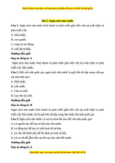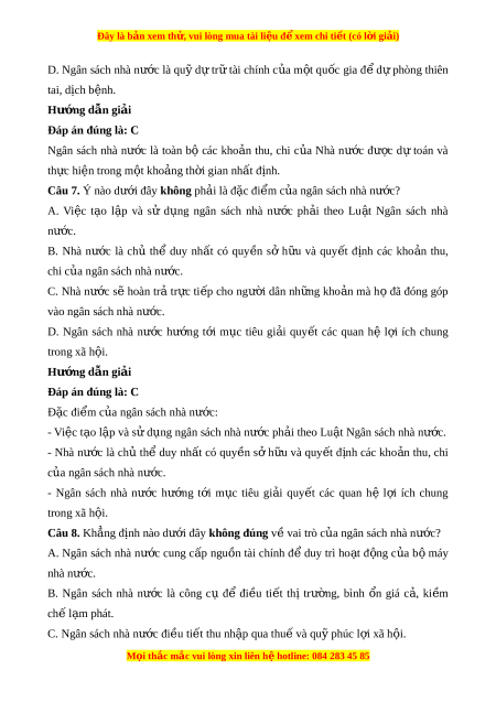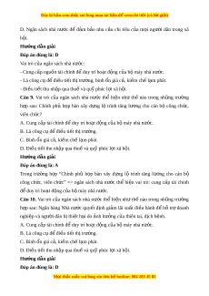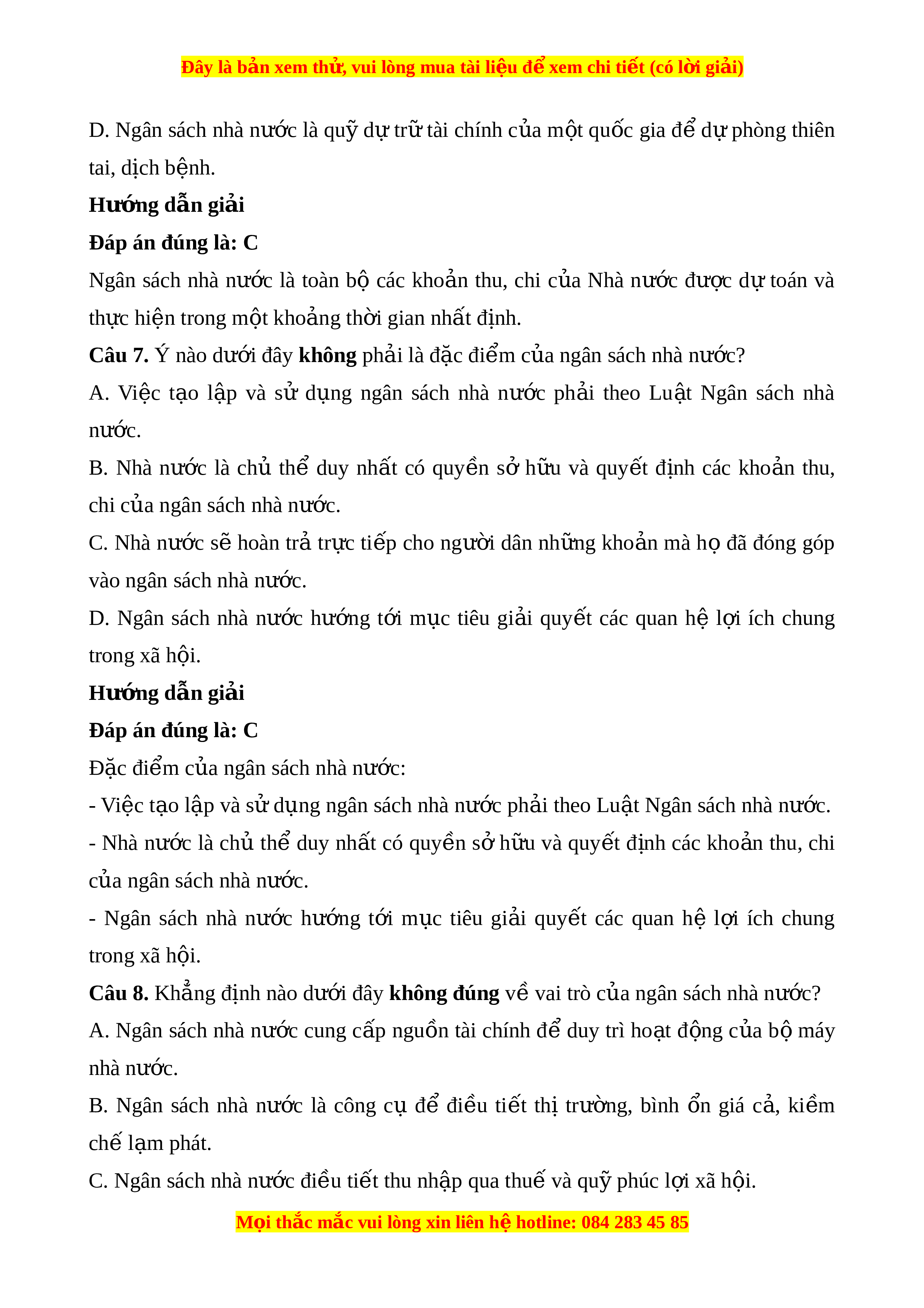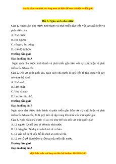 Đây là bản xem th , vu ử i lòng mua tài li u ệ đ xe ể m chi ti t ế (có l i ờ gi i ả ) D. Ngân sách nhà nư c ớ là qu ỹ d ự tr ữ tài chính c a ủ m t ộ qu c ố gia đ ể d ự phòng thiên tai, d ch b ị ệnh. Hư ng d ớ ẫn gi i ả Đáp án đúng là: C Ngân sách nhà nư c ớ là toàn bộ các kho n ả thu, chi c a ủ Nhà nư c ớ đư c ợ d ự toán và th c ự hi n t ệ rong m t ộ kho ng t ả h i ờ gian nh t ấ đ nh. ị Câu 7. Ý nào dư i ớ đây không ph i ả là đ c ặ đi m ể c a ngân ủ sách nhà nư c? ớ A. Vi c ệ t o ạ l p ậ và sử d ng ụ ngân sách nhà nư c ớ ph i ả theo Lu t ậ Ngân sách nhà nư c. ớ B. Nhà nư c ớ là chủ thể duy nh t ấ có quy n ề sở h u ữ và quy t ế đ nh ị các kho n ả thu, chi c a ủ ngân sách nhà nư c. ớ C. Nhà nư c ớ sẽ hoàn tr ả tr c ự ti p ế cho ngư i ờ dân nh ng ữ kho n ả mà h ọ đã đóng góp vào ngân sách nhà nư c. ớ D. Ngân sách nhà nư c ớ hư ng ớ t i ớ m c ụ tiêu gi i ả quy t ế các quan hệ l i ợ ích chung trong xã h i ộ . Hư ng d ớ ẫn gi i ả Đáp án đúng là: C Đặc đi m ể c a ủ ngân sách nhà nư c: ớ - Vi c t ệ o l ạ p ậ và sử d ng ngân s ụ ách nhà nư c ớ ph i ả theo Lu t ậ Ngân sách nhà nư c. ớ - Nhà nư c ớ là chủ th ể duy nh t ấ có quy n ề s ở h u ữ và quy t ế đ nh ị các kho n ả thu, chi c a ủ ngân sách nhà nư c. ớ - Ngân sách nhà nư c ớ hư ng ớ t i ớ m c ụ tiêu gi i ả quy t ế các quan hệ l i ợ ích chung trong xã h i ộ . Câu 8. Kh ng ẳ đ nh nào d ị ư i