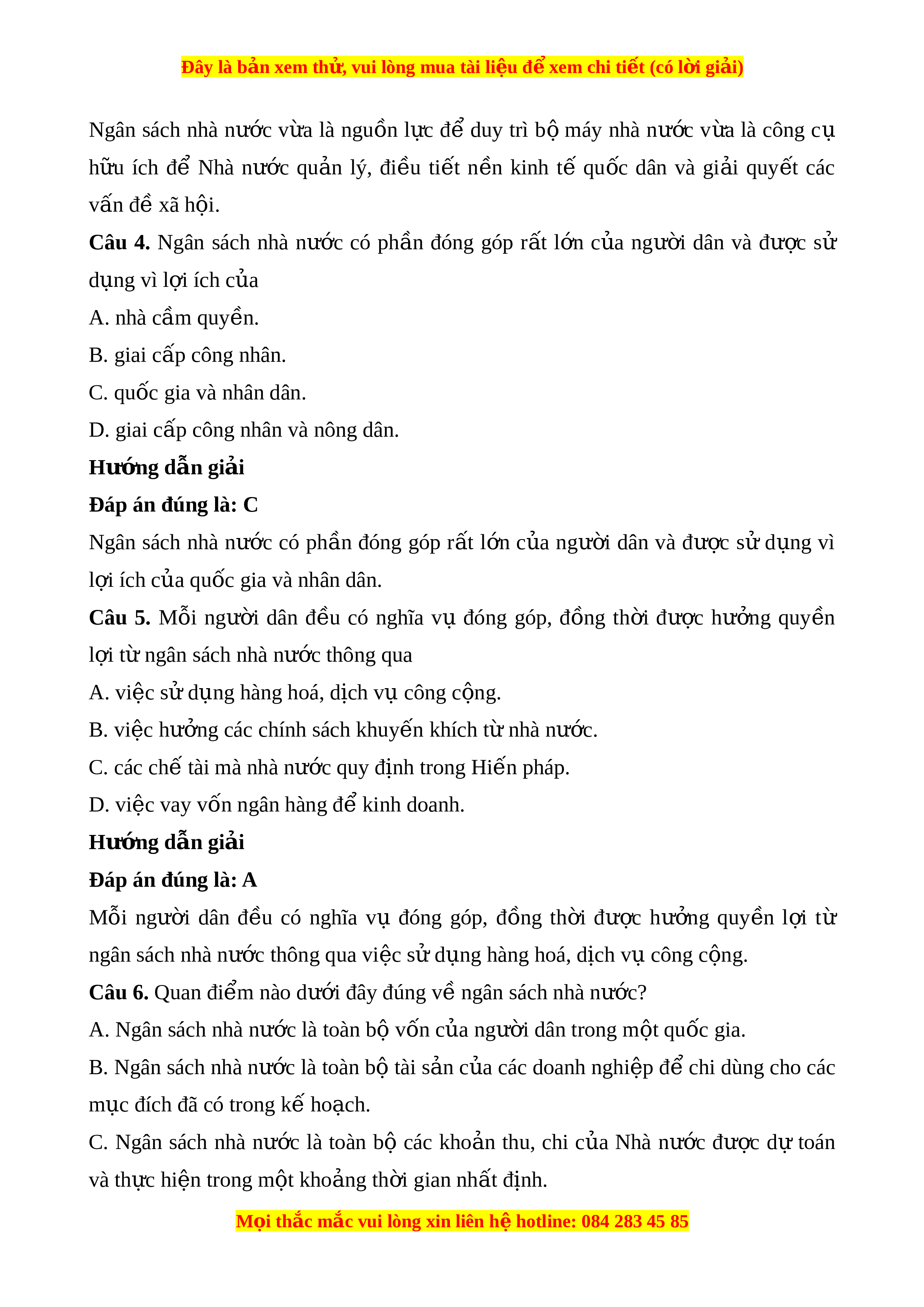 Câu 4. Ngân sách nhà nư c ớ có ph n ầ đóng góp r t ấ l n ớ c a ủ ngư i ờ dân và đư c ợ sử d ng vì ụ l i ợ ích c a ủ A. nhà c m ầ quy n. ề B. giai c p công nhân. ấ C. quốc gia và nhân dân. D. giai c p công nhân ấ và nông dân. Hư ng d ớ ẫn gi i ả Đáp án đúng là: C Ngân sách nhà nư c ớ có ph n ầ đóng góp r t ấ l n ớ c a ủ ngư i ờ dân và đư c ợ s ử d ng ụ vì l i ợ ích c a