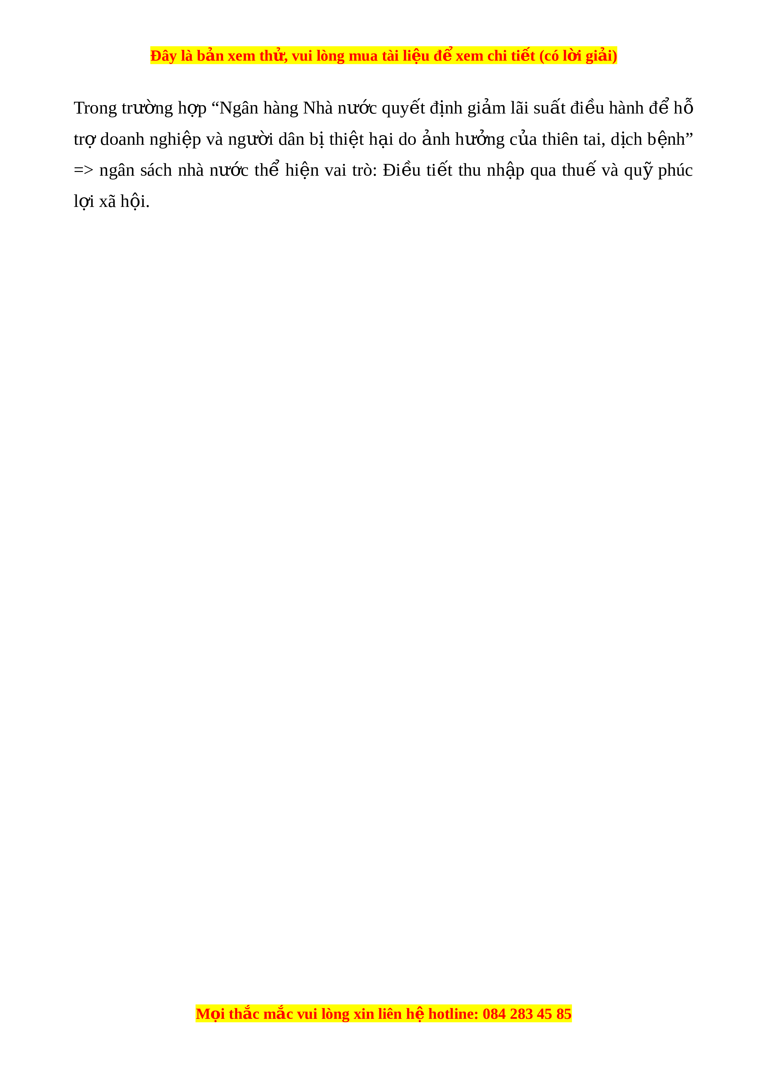 ợ sau: Ngân hàng Nhà nư c ớ quy t ế đ nh ị gi m ả lãi su t ấ đi u ề hành đ ể h ỗ tr ợ doanh nghiệp và ngư i ờ dân bị thi t ệ h i ạ do nh ả hư ng c ở a ủ thiên tai, d ch b ị nh. ệ A. Cung c p t ấ ài chính đ duy t ể rì ho t ạ đ ng c ộ a ủ b m ộ áy nhà nư c. ớ B. Là công c đ ụ đi ể u t ề i t ế th t ị rư ng. ờ C. Bình n gi ổ á c , ki ả m ề chế l m ạ phát. D. Đi u ề ti t ế thu nh p ậ qua thu và qu ế phúc ỹ l i ợ xã h i ộ . Hư ng d ớ ẫn gi i ả Đáp án đúng là: D M i ọ thắc m c