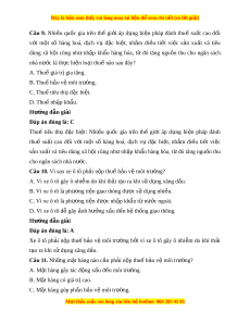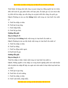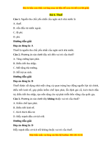 Câu 1. Nguồn thu ch y ủ u nh ế t ấ c a ủ ngân sách nhà nư c l ớ à A. thu . ế B. vốn đ u t ầ n ư ư c ớ ngoài. C. l phí ệ . D. phí. Hư ng d ớ ẫn gi i ả Đáp án đúng là: A Thu l ế à ngu n t ồ hu ch y ủ u nh ế t ấ c a ngân s ủ ách nhà nư c. ớ Câu 2. Phư ng ơ án nào dư i ớ đây nói đ n vai ế trò c a ủ thu ? ế A. Tăng cư ng l ờ m ạ phát. B. Đi u t ề i t ế thu nh p. ậ C. M r ở ng t ộ h t ị rư ng. ờ D. Hỗ tr an s ợ inh. Hư ng d ớ ẫn gi i ả Đáp án đúng là: B Thuế đư c ợ sử d ng ụ như m t ộ công cụ quan tr ng ọ huy đ ng ộ ngu n ồ l c ự tài chính, đi u ề ti t ế kinh t , ế góp ph n ầ ki m ề chế l m ạ phát, n ổ đ nh ị giá c , ả kích thích đ u ầ t , đi ư u t ề i t ế thu nh p, ậ t o n ạ n t ề ng ả cho sự phát tri n b ể n v ề ng ữ c a qu ủ c gi ố a. Câu 3. Phư ng ơ án nào dư i