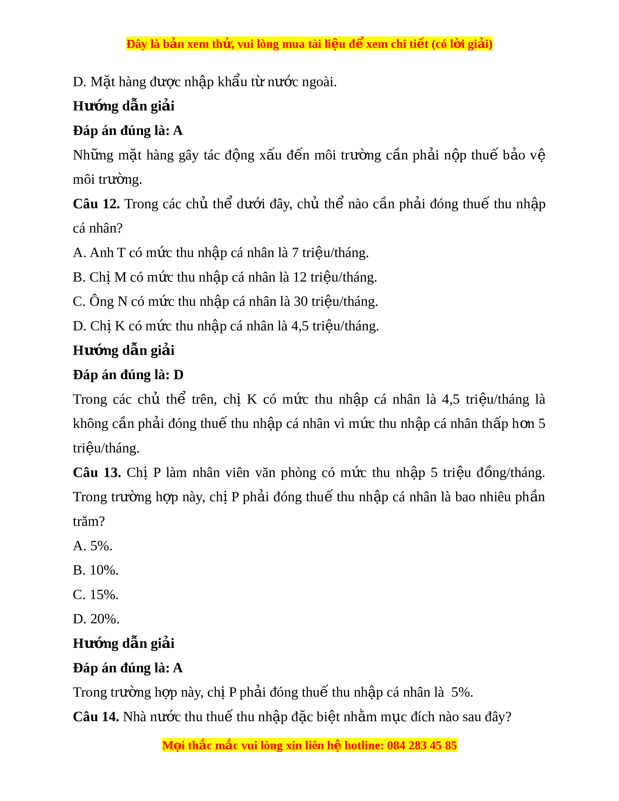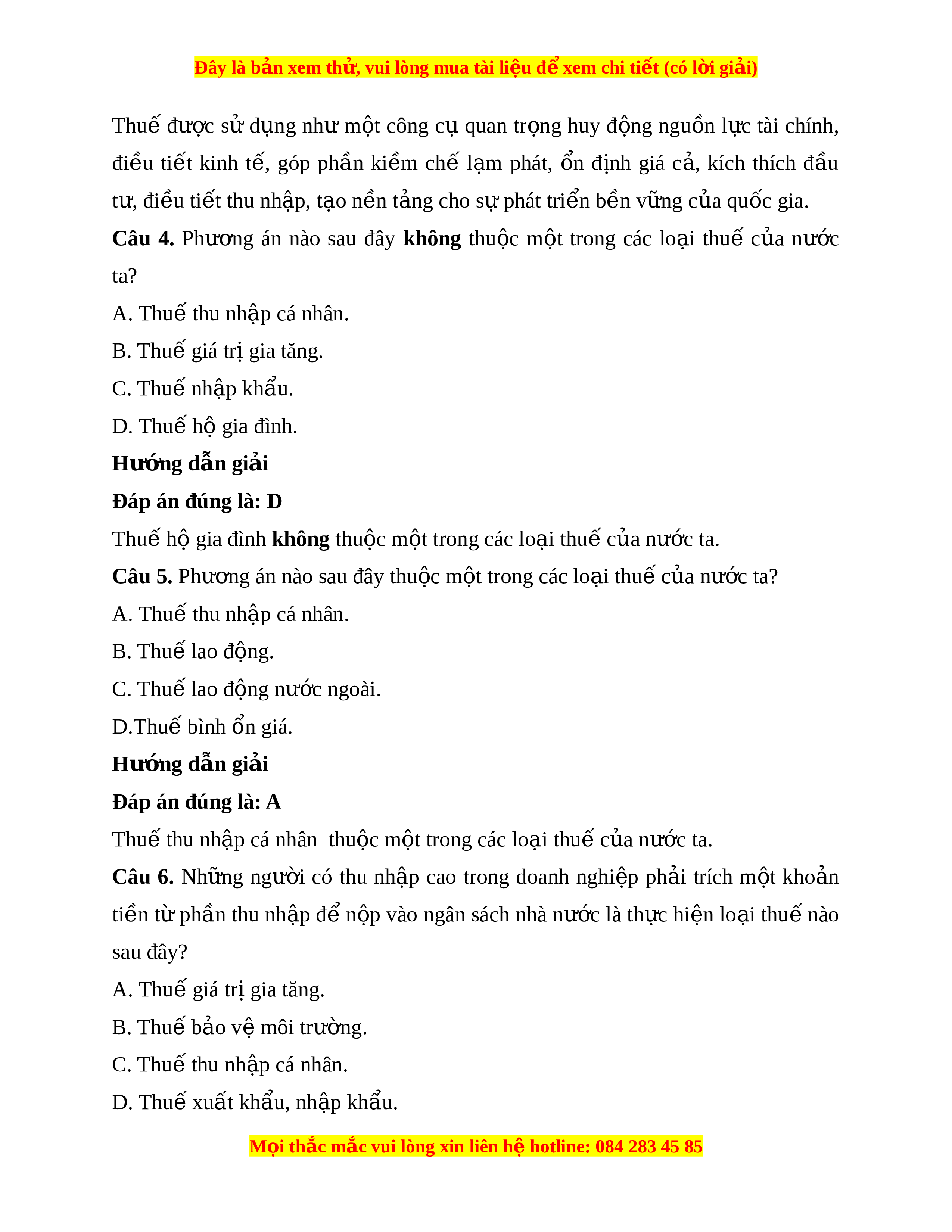 ộ a đình không thu c m ộ t ộ trong các lo i ạ thuế c a n ủ ư c ớ ta. Câu 5. Phư ng ơ án nào sau đây thu c m ộ t ộ trong các lo i ạ thu c ế a n ủ ư c ớ ta? A. Thuế thu nh p ậ cá nhân. B. Thu l ế ao đ ng. ộ C. Thu l ế ao đ ng n ộ ư c ớ ngoài. D.Thu bì ế nh n gi ổ á. Hư ng d ớ ẫn gi i ả Đáp án đúng là: A Thu t ế hu nh p cá ậ nhân thu c m ộ t ộ trong các lo i ạ thu c ế a n ủ ư c ớ ta. Câu 6. Nh ng ữ ngư i ờ có thu nh p ậ cao trong doanh nghi p ệ ph i ả trích m t ộ kho n ả ti n ề từ ph n ầ thu nh p ậ đ ể n p