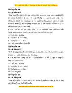 ủ ô tô phát sinh trong quá trình t s ừ n ả xu t ấ , l u ư thông đ n ế tiêu dùng. Câu 8. Do doanh nghi p ệ v n ẫ ph i ả nh p ậ kh u ẩ linh ki n ệ đ ể l p ắ ráp ô tô nên ph i ả n p ộ thuế nào sau đây? A. Thuế giá tr gi ị a tăng. B. Thu b ế o v ả m ệ ôi trư ng. ờ C. Thu t ế hu nh p cá ậ nhân. D. Thuế nh p kh ậ ẩu. Hư ng d ớ ẫn gi i ả Đáp án đúng là: D Thu nh ế p kh ậ u: ẩ Do doanh nghi p v ệ n ph ẫ i ả nh p ậ kh u l ẩ inh ki n đ ệ l ể p ắ ráp ô tô nên vẫn ph i ả n p t ộ hu nh ế p kh ậ u. ẩ M i