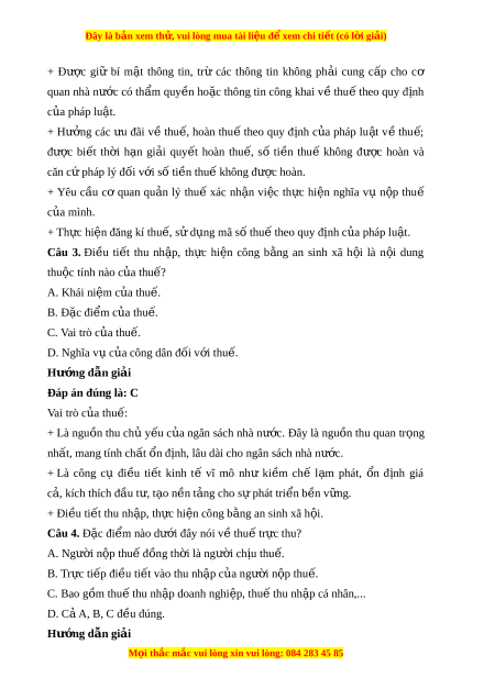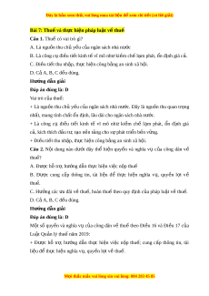 Đây là bản xem th , vu ử i lòng mua tài li u ệ đ xe ể m chi ti t ế (có l i ờ gi i ả ) Bài 7: Thu và t ế h c h ự i n pháp l ệ u t ậ v t ề huế Câu 1. Thu có ế vai trò gì? A. Là nguồn thu ch y ủ u ế c a ngân s ủ ách nhà nư c ớ B. Là công c đi ụ u t ề i t ế kinh t vĩ ế mô nh ki ư m ề chế l m ạ phát, n đ ổ nh g ị iá c . ả C. Đi u t ề i t ế thu nh p, ậ th c hi ự n công b ệ ng an ằ sinh xã h i ộ . D. Cả A, B, C đ u đúng. ề Hư ng ớ d n gi ẫ i ả Đáp án đúng là: D Vai trò c a t ủ hu : ế + Là ngu n ồ thu ch y ủ u ế c a ủ ngân sách nhà nư c. ớ Đây là ngu n ồ thu quan tr ng ọ nh t ấ , mang tính ch t ấ n đ ổ nh, l ị