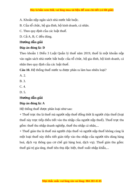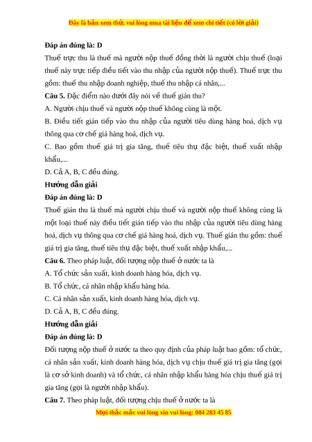 Đây là bản xem th , vu ử i lòng mua tài li u ệ đ xe ể m chi ti t ế (có l i ờ gi i ả ) Đáp án đúng là: D Thuế tr c ự thu là thuế mà ngư i ờ n p ộ thuế đ ng ồ th i ờ là ngư i ờ ch u ị thuế (lo i ạ thuế này tr c ự ti p ế đi u ề ti t ế vào thu nh p ậ c a ủ ngư i ờ n p ộ thu ) ế . Thu ế tr c ự thu gồm: thu t ế hu nh p ậ doanh nghi p, t ệ hu t ế hu nh p cá ậ nhân,... Câu 5. Đ c ặ đi m ể nào dư i ớ đây nói v t ề hu gi ế án thu? A. Ngư i ờ chịu thu và ng ế ư i ờ n p t ộ hu không cùng l ế à m t ộ . B. Đi u ề ti t ế gián ti p ế vào thu nh p ậ c a ủ ngư i