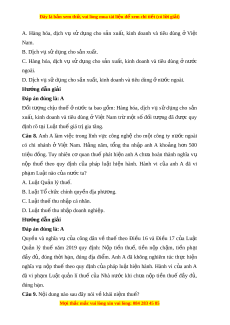 xuất, kinh doanh và tiêu dùng ở Vi t ệ Nam trừ m t ộ s ố đ i ố tư ng ợ đã đư c ợ quy định rõ t i ạ Lu t ậ thu gi ế á tr gi ị a tăng. Câu 8. Anh A làm vi c ệ trong lĩnh v c ự công nghệ cho m t ộ công ty nư c ớ ngoài có chi nhánh ở Vi t ệ Nam. H ng ằ năm, t ng ổ thu nh p ậ anh A kho ng ả h n ơ 500 tri u ệ đ ng. ồ Tuy nhiên cơ quan thu ế phát hi n ệ anh A ch a ư hoàn thành nghĩa vụ n p ộ thuế theo quy đ nh ị c a ủ pháp lu t ậ hi n ệ hành. Hành vi c a ủ anh A đã vi ph m ạ Lu t ậ nào c a n ủ ư c ớ ta? A. Lu t ậ Qu n ả lý thu . ế B. Lu t ậ T ch ổ c ứ chính quy n đ ề a ph ị ư ng. ơ C. Lu t ậ thu t ế hu nh p cá nhân. ậ D. Lu t ậ thu t ế hu nh p ậ doanh nghi p. ệ Hư ng d ớ ẫn gi i ả Đáp án đúng là: A Quy n ề và nghĩa vụ c a