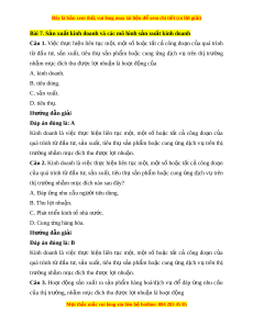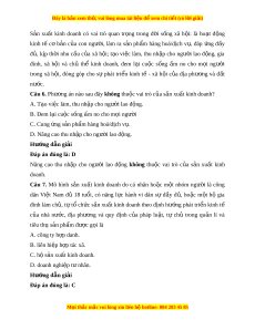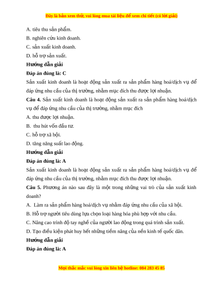 Đây là bản xem th , vu ử i lòng mua tài li u ệ đ xe ể m chi ti t (c ế ó l i ờ gi i ả ) A. tiêu thu s n ph ả m ẩ . B. nghiên c u ki ứ nh doanh. C. s n ả xu t ấ kinh doanh. D. hỗ tr s ợ n ả xu t ấ . Hư ng d ớ ẫn gi i ả Đáp án đúng là: C S n ả xu t ấ kinh doanh là ho t ạ đ ng ộ s n ả xu t ấ ra s n ả ph m ẩ hàng hoá/d ch ị vụ để đáp ng ứ nhu cầu c a t ủ hị trư ng, ờ nh m ằ m c đí ụ ch thu đư c ợ l i ợ nhu n. ậ Câu 4. S n ả xu t ấ kinh doanh là ho t ạ đ ng ộ s n ả xu t ấ ra s n ả ph m ẩ hàng hoá/d ch ị v đ ụ ể đáp ng nhu c ứ ầu c a t ủ hị trư ng, nh ờ m ằ m c ụ đích A. thu đư c ợ l i ợ nhu n. ậ B. thu hút v n đ ố u t ầ . ư C. hỗ tr xã h ợ i ộ . D. tăng năng su t ấ lao đ ng. ộ Hư ng d ớ ẫn gi i ả Đáp án đúng là: A S n ả xu t ấ kinh doanh là ho t ạ đ ng ộ s n ả xu t ấ ra s n ả ph m ẩ hàng hoá/d ch ị vụ để đáp ng ứ nhu cầu c a t ủ hị trư ng, ờ nh m ằ m c đí ụ ch thu đư c ợ l i ợ nhu n. ậ Câu 5. Phư ng ơ án nào sau đây là m t ộ trong nh ng ữ vai trò c a ủ s n ả xu t ấ kinh doanh? A. Làm ra s n ả ph m ẩ hàng hoá/d ch ị v nh ụ m ằ đáp ng nhu c ứ u c ầ a ủ xã h i ộ . B. Hỗ tr ng ợ ư i ờ tiêu dùng l a ch ự n l ọ o i ạ hàng hóa phù h p v ợ i ớ nhu c u. ầ C. Nâng cao trình đ t ộ ay ngh c ề a ủ ngư i ờ lao đ ng t ộ rong quá trình s n xu ả t ấ . D. T o đi ạ u ki ề ện phát huy h t ế nh ng t ữ i m ề năng c a ủ n n ki ề nh t qu ế c ố dân. Hư ng d ớ ẫn gi i ả Đáp án đúng là: A M i