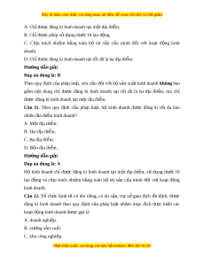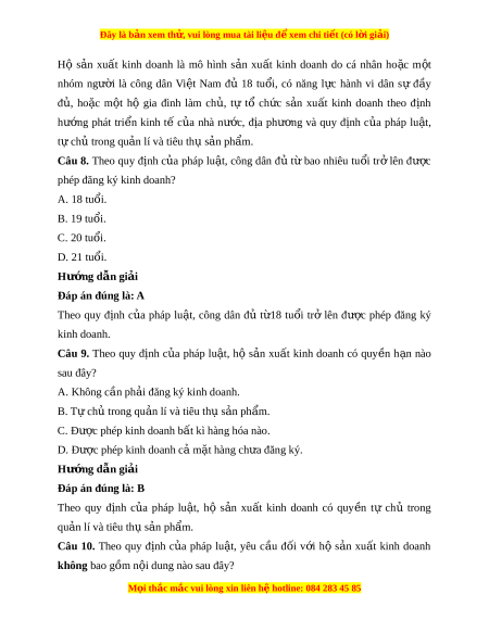 ấ kinh doanh do cá nhân ho c ặ m t ộ nhóm ngư i ờ là công dân Vi t ệ Nam đủ 18 tu i ổ , có năng l c ự hành vi dân sự đ y ầ đ , ủ ho c ặ m t ộ hộ gia đình làm ch , ủ tự tổ ch c ứ s n ả xu t ấ kinh doanh theo đ nh ị hư ng ớ phát tri n ể kinh tế c a ủ nhà nư c, ớ đ a ị phư ng ơ và quy đ nh ị c a ủ pháp lu t ậ , t ch ự ủ trong qu n ả lí và tiêu th s ụ n ả ph m ẩ . Câu 8. Theo quy đ nh ị c a ủ pháp lu t ậ , công dân đ ủ t ừ bao nhiêu tu i ổ tr ở lên đư c ợ phép đăng ký kinh doanh? A. 18 tuổi. B. 19 tuổi. C. 20 tuổi. D. 21 tuổi. Hư ng d ớ ẫn gi i ả Đáp án đúng là: A Theo quy đ nh ị c a ủ pháp lu t ậ , công dân đủ t 18 ừ tu i ổ trở lên đư c ợ phép đăng ký kinh doanh. Câu 9. Theo quy đ nh ị c a ủ pháp lu t ậ , hộ s n ả xu t ấ kinh doanh có quy n ề h n ạ nào sau đây? A. Không cần ph i ả đăng ký kinh doanh. B. T ch ự t ủ rong qu n l ả í và tiêu th s ụ n ph ả m ẩ . C. Đư c phép ợ kinh doanh b t ấ kì hàng hóa nào.