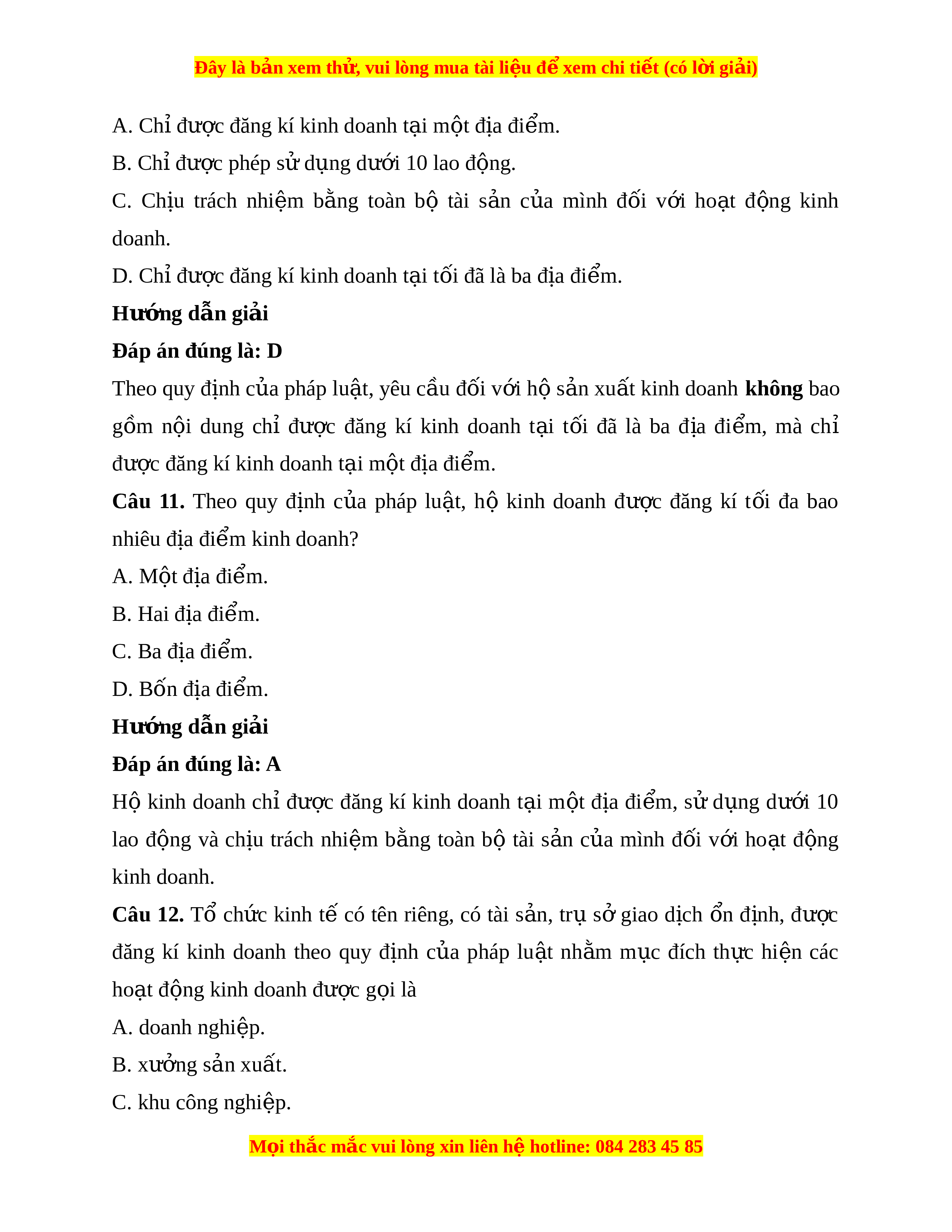 Câu 11. Theo quy đ nh c a pháp lu t, h kinh doanh đ c đăng kí t i đa baoị ủ ậ ộ ượ ố