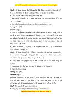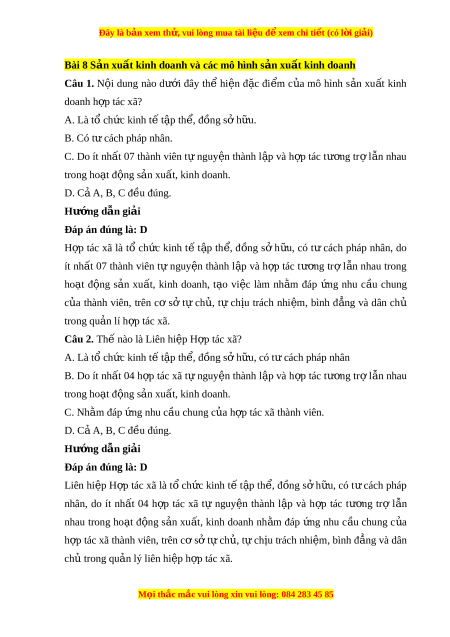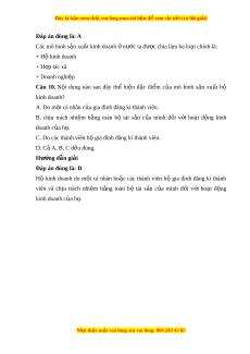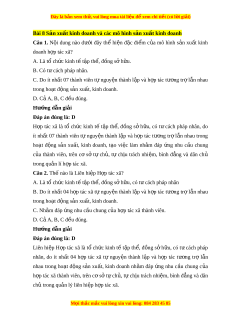 ấ kinh doanh và các mô hình s n xu ả t ấ kinh doanh Câu 1. N i ộ dung nào dư i ớ đây th ể hi n ệ đ c ặ đi m ể c a ủ mô hình s n ả xu t ấ kinh doanh h p t ợ ác xã? A. Là tổ ch c ứ kinh t t ế p t ậ h , đ ể ng s ồ ở h u. ữ B. Có t cách pháp nhân. ư C. Do ít nh t ấ 07 thành viên t ự nguy n ệ thành l p ậ và h p ợ tác tư ng ơ tr ợ l n ẫ nhau trong ho t ạ đ ng s ộ n ả xu t ấ , kinh doanh. D. Cả A, B, C đ u đúng. ề Hư ng ớ d n gi ẫ i ả Đáp án đúng là: D H p ợ tác xã là tổ ch c ứ kinh t ế t p ậ th , ể đ ng ồ s ở h u, ữ có t ư cách pháp nhân, do ít nh t