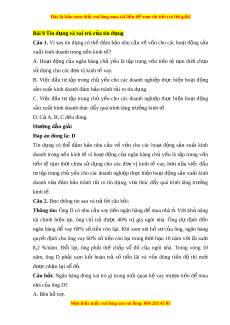 Câu 1. Vì sao tín d ng có ụ th đ ể m ả b o ả nhu c u v ầ v ề n cho ố các ho t ạ đ ng ộ s n ả xu t ấ kinh doanh trong n n ki ề nh t ? ế A. Ho t ạ đ ng ộ c a ủ ngân hàng chủ y u ế là t p ậ trung v n ố ti n ề t ệ t m ạ th i ờ ch a ư s d ử ng ụ cho các đ n ơ vị kinh t vay ế . B. Vi c ệ đ u ầ tư t p ậ trung chủ y u ế cho các doanh nghi p ệ th c ự hi n ệ ho t ạ đ ng ộ s n ả xu t ấ kinh doanh đ m ả b o t ả ránh r i ủ ro tín d ng. ụ C. Vi c ệ đ u ầ tư t p ậ trung chủ y u ế cho các doanh nghi p ệ th c ự hi n ệ ho t ạ đ ng ộ s n ả xu t ấ kinh doanh thúc đ y quá ẩ trình tăng trư ng ki ở nh t . ế D. Cả A, B, C đ u đúng. ề Hư ng ớ d n gi ẫ i ả Đáp án đúng là: D Tín d ng ụ có thể đ m ả b o ả nhu c u ầ về v n ố cho các ho t ạ đ ng ộ s n ả xu t ấ kinh doanh trong n n ề kinh t ế vì ho t ạ đ ng ộ c a ủ ngân hàng ch ủ y u ế là t p ậ trung v n ố ti n ề tệ t m ạ th i ờ ch a ư sử d ng ụ cho các đ n ơ vị kinh tế vay, h n ơ n a ữ vi c ệ đ u ầ t t ư p ậ trung chủ y u ế cho các doanh nghi p t ệ h c ự hi n ho ệ t ạ đ ng ộ s n ả xu t ấ kinh doanh v a ừ đ m ả b o ả tránh r i ủ ro tín d ng, ụ v a ừ thúc đ y ẩ quá trình tăng trư ng ở kinh t . ế Câu 2. Đ c t