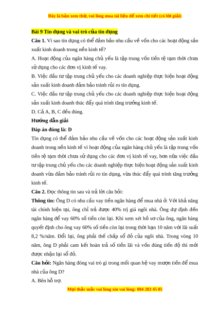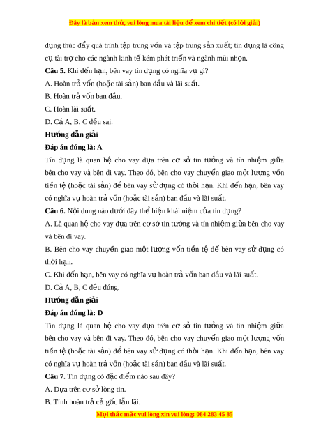 Đây là bản xem th , vu ử i lòng mua tài li u ệ đ xe ể m chi ti t ế (có l i ờ gi i ả ) d ng ụ thúc đ y ẩ quá trình t p ậ trung v n ố và t p ậ trung s n ả xu t ấ ; tín d ng ụ là công c t ụ ài tr cho các ợ ngành kinh t kém ế phát tri n và ể ngành mũi nh n. ọ Câu 5. Khi đ n h ế n, bên ạ vay tín d ng có nghĩ ụ a v gì ụ ? A. Hoàn tr v ả ốn (hoặc tài s n) ả ban đ u và l ầ ãi su t ấ . B. Hoàn tr v ả ốn ban đầu. C. Hoàn lãi su t ấ . D. Cả A, B, C đ u s ề ai. Hư ng ớ d n gi ẫ i ả Đáp án đúng là: A Tín d ng ụ là quan hệ cho vay d a ự trên cơ sở tin tư ng ở và tín nhi m ệ gi a ữ