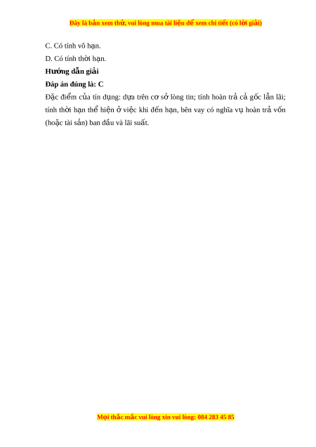 Đây là bản xem th , vu ử i lòng mua tài li u ệ đ xe ể m chi ti t (c ế ó l i ờ gi i ả ) C. Tính th i ờ h n. ạ D. C ả A, B, C đ u ề đúng. Hư ng d ớ ẫn gi i ả Đáp án đúng là: D Đặc đi m ể c a ủ tín d ng: ụ d a