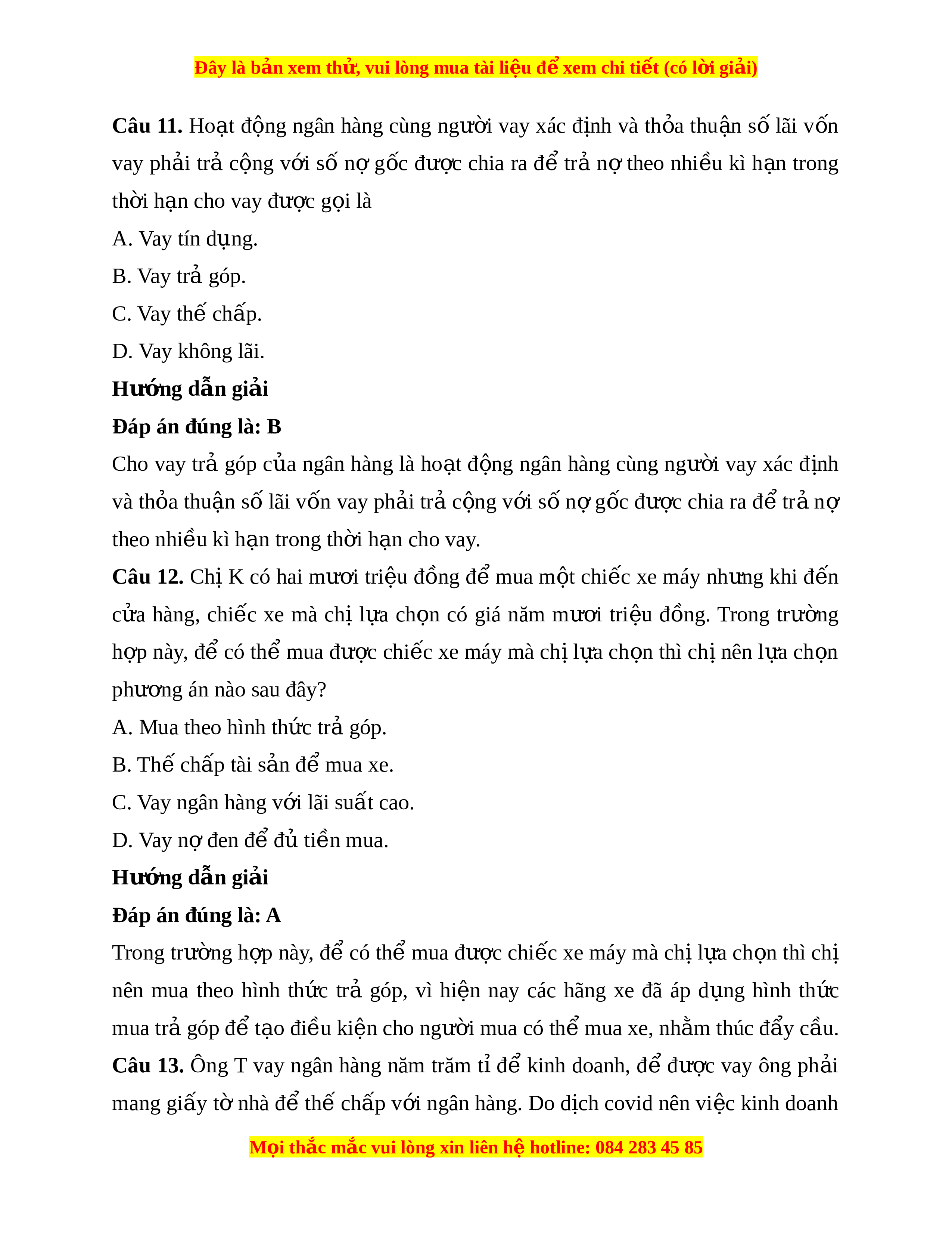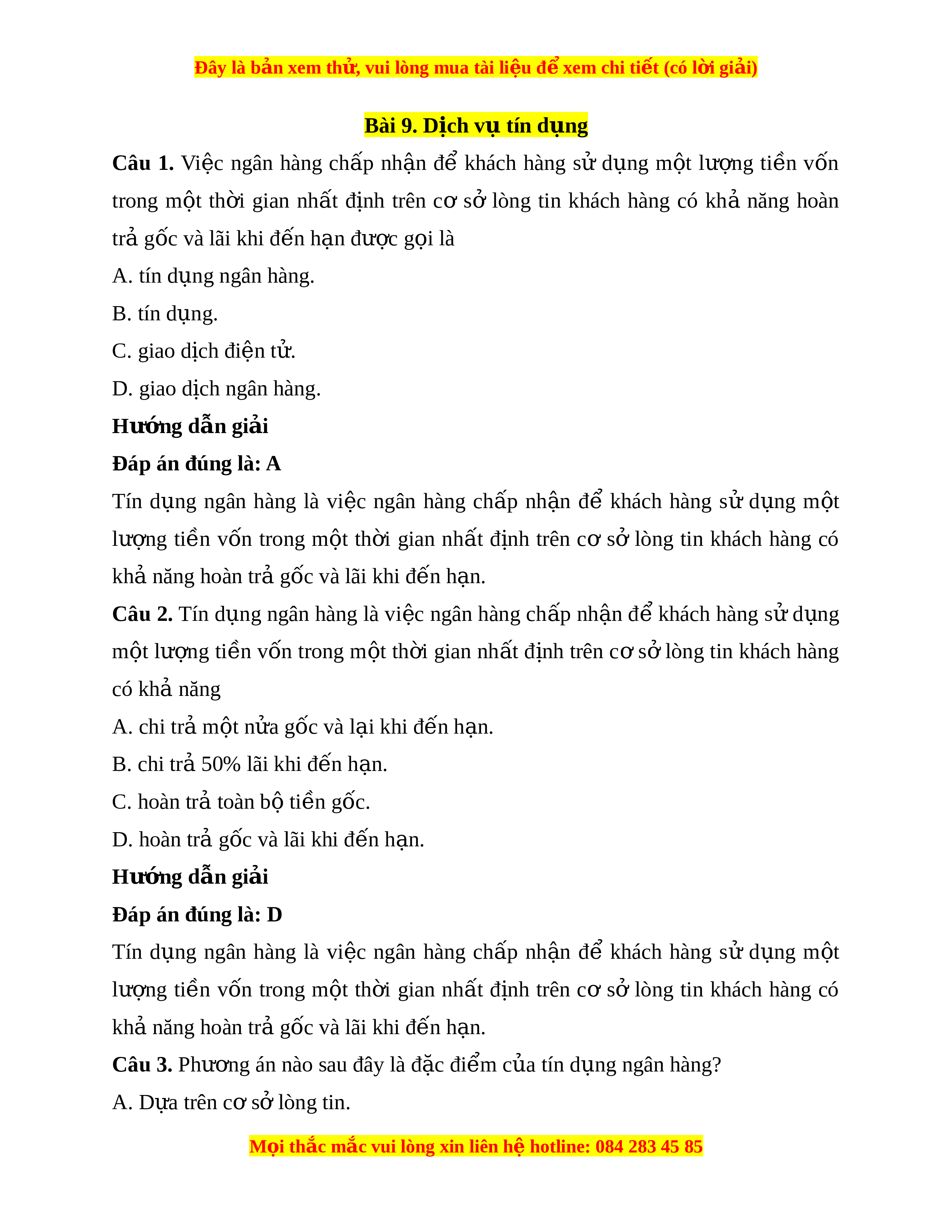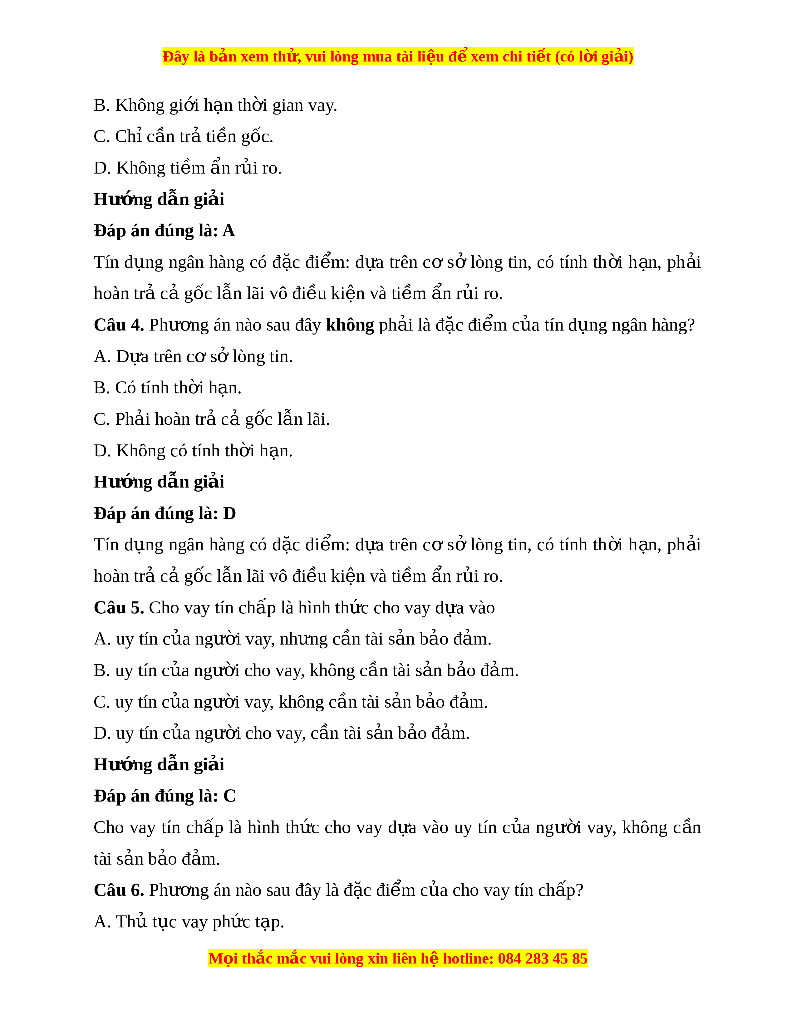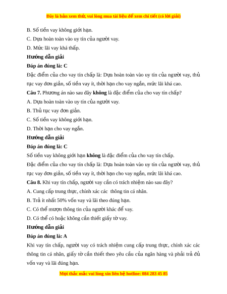Đây là bản xem th , vu ử i lòng mua tài li u ệ đ xe ể m chi ti t (c ế ó l i ờ gi i ả ) B. Không gi i ớ h n t ạ h i ờ gian vay. C. Ch c ỉ n t ầ rả ti n g ề ốc. D. Không ti m ề n r ẩ i ủ ro. Hư ng d ớ ẫn gi i ả Đáp án đúng là: A Tín d ng ụ ngân hàng có đ c ặ đi m ể : d a ự trên c ơ s ở lòng tin, có tính th i ờ h n, ạ ph i ả hoàn tr c ả g