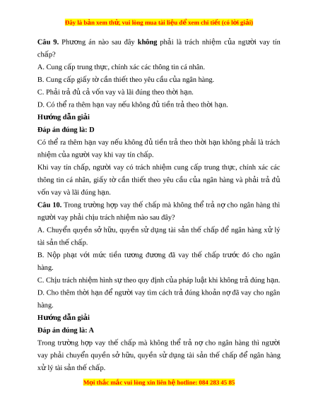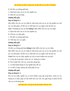 nh xác các thông tin cá nhân. B. Cung c p gi ấ y t ấ c ờ n t ầ hi t ế theo yêu c u c ầ a ngân ủ hàng. C. Ph i ả tr đ ả c ủ v ả n vay ố và lãi đúng theo th i ờ h n. ạ D. Có th r ể a thêm h n vay n ạ u không đ ế ủ ti n ề tr t ả heo th i ờ h n. ạ Hư ng d ớ ẫn gi i ả Đáp án đúng là: D Có thể ra thêm h n ạ vay n u ế không đ ủ ti n ề tr ả theo th i ờ h n ạ không ph i ả là trách nhiệm c a ng ủ ư i ờ vay khi vay tín ch p. ấ Khi vay tín ch p, ấ ngư i ờ vay có trách nhi m ệ cung c p ấ trung th c, ự chính xác các thông tin cá nhân, gi y ấ tờ c n ầ thi t ế theo yêu c u ầ c a ủ ngân hàng và ph i ả trả đủ vốn vay và lãi đúng h n. ạ Câu 10. Trong trư ng ờ h p ợ vay thế ch p